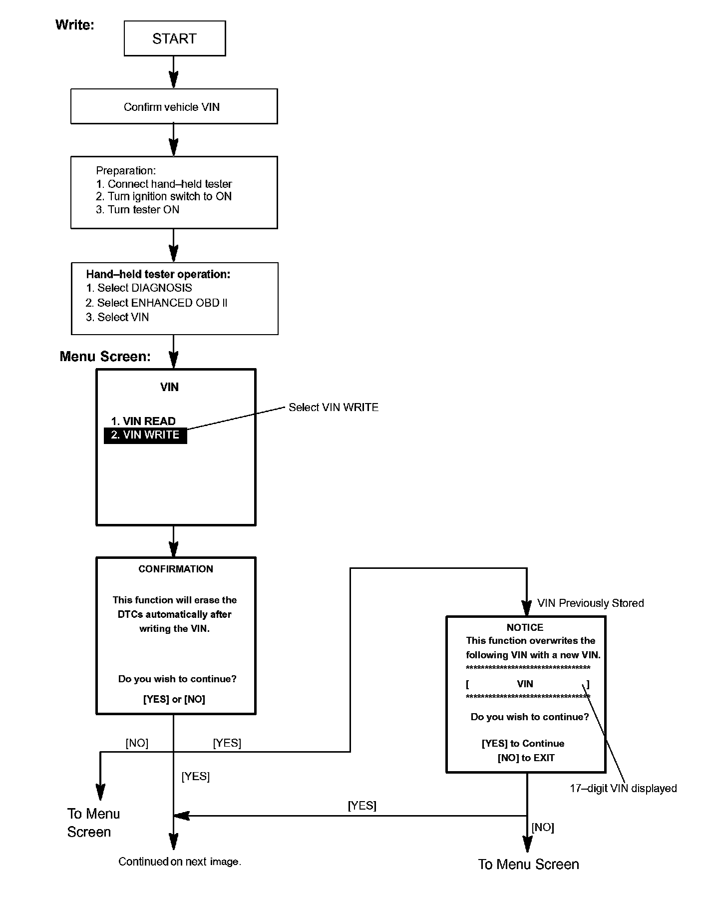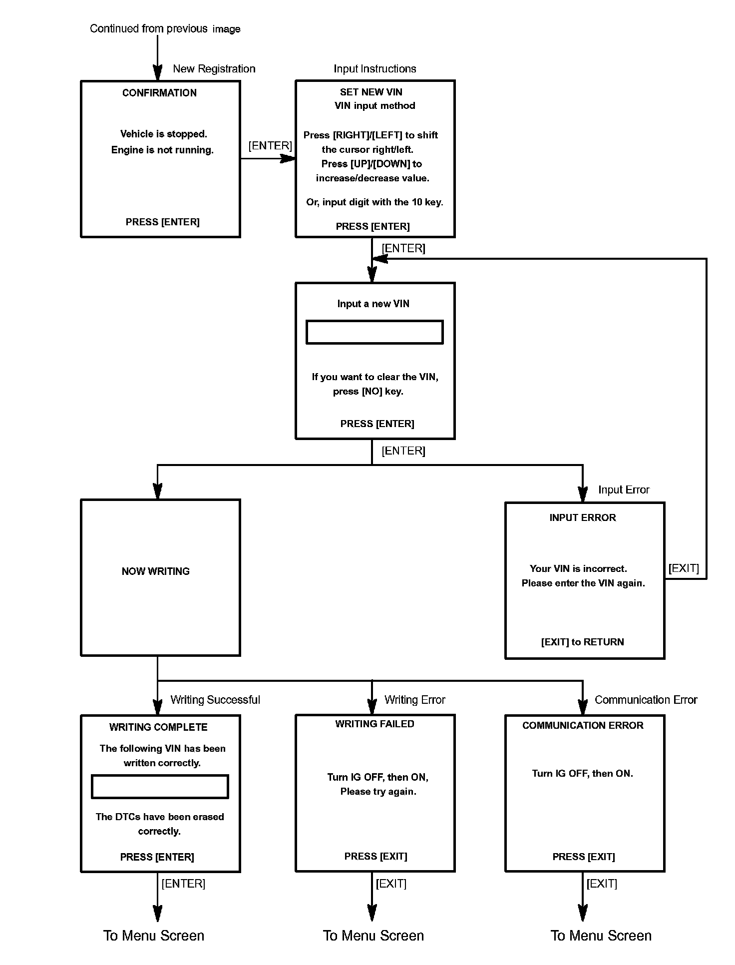 c. Write VIN: Explains the VIN writing process in a flowchart. This process allows the VIN to be input into the ECM. If the ECM is changed, or the VIN and VIN do not match, the VIN can be registered, or overwritten in the ECM by following this procedure.