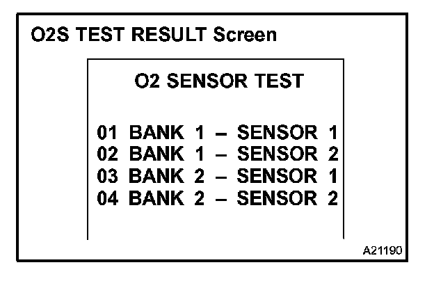 b. On the tester screen, select the following menus: DIAGNOSIS/ CARB OBD II/O2S TEST RESULT. A list of the O2S equipped on the vehicle will be displayed.