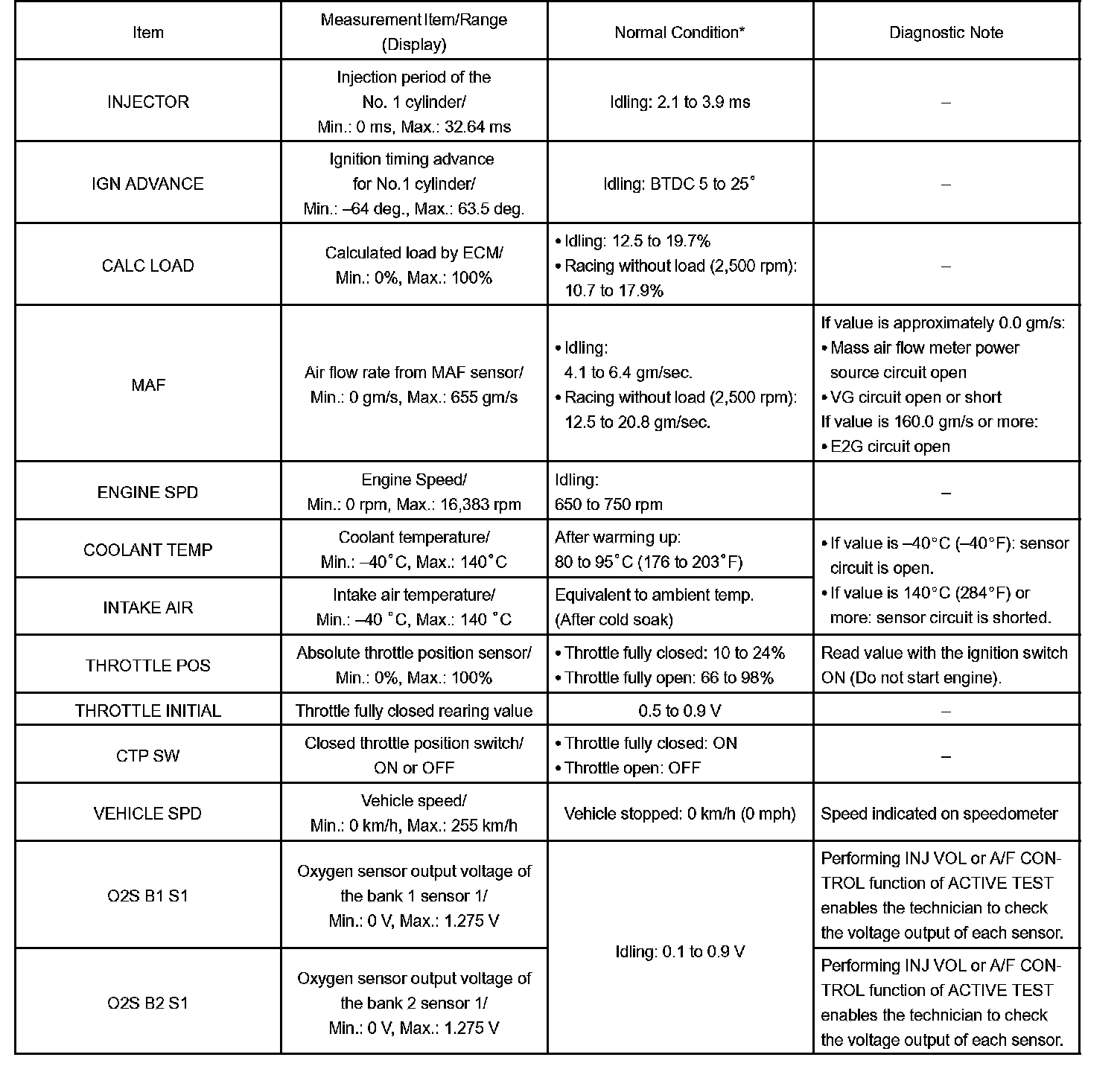 NOTE: In the table, the values listed under "Normal Condition" are reference values. Do not depend solely on these reference values when deciding whether a part is faulty or not.