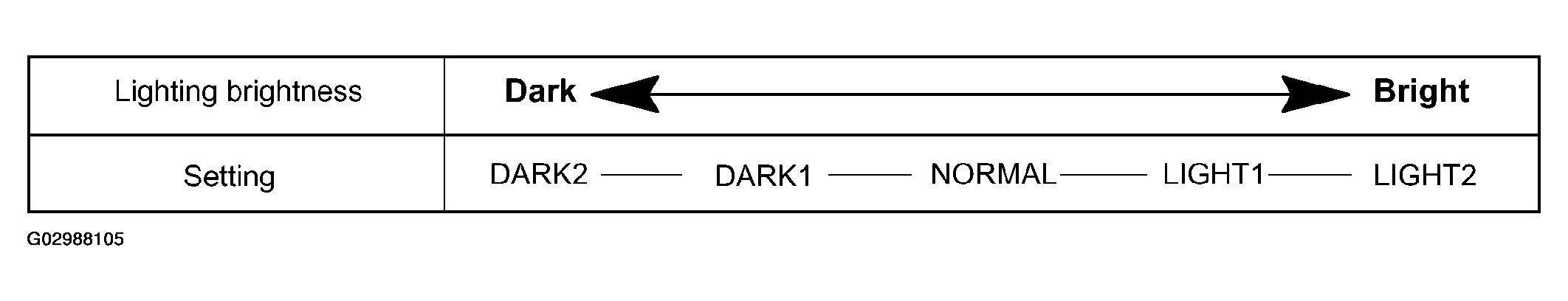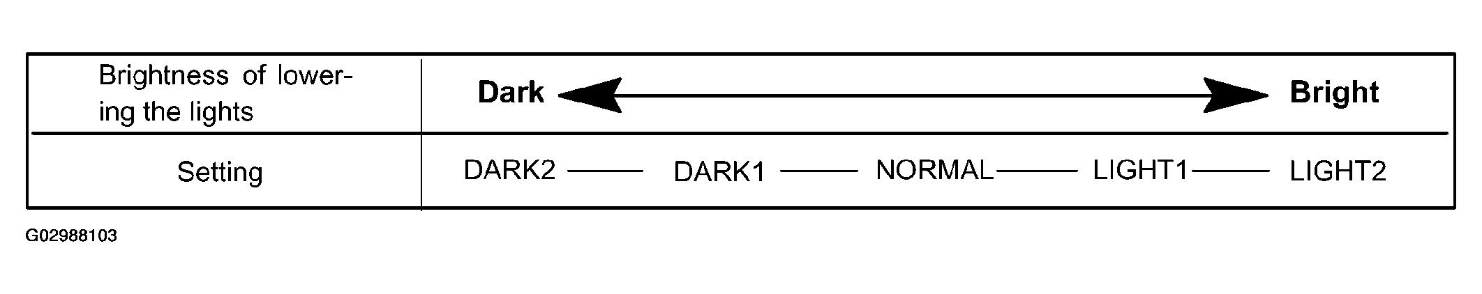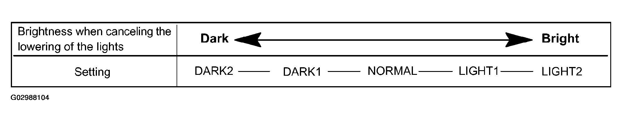 | DISP EX ON SEN (#) (Display Extinction Luminous Intensity) | NORMAL | To change the brightness of lowering the lights such as the indicator light of the combination meter, A/C indicator light, clock. Refer to Fig 2. | DARK2 / DARK1 / NORMAL / LIGHT1 / LIGHT2 |