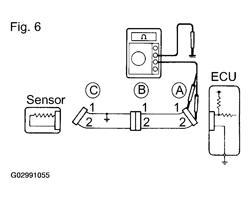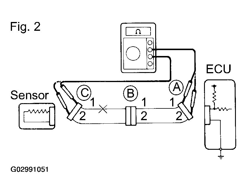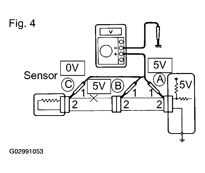 1. As shown in Fig 12, with each connector still connected, measure the voltage between body ground and terminal 1 of connector "A" at the ECU 5V output terminal, terminal 1 of connector "B", and terminal 1 of connector "C", in that order.