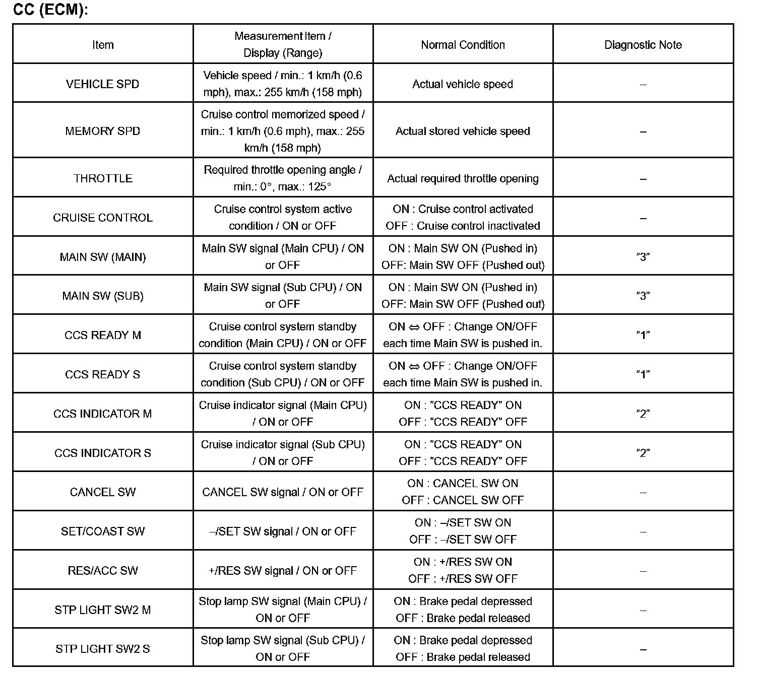 "3" is OK but cruise indicator not turn on -> CRUISE MAIN indicator or wire harness or ECM failure
