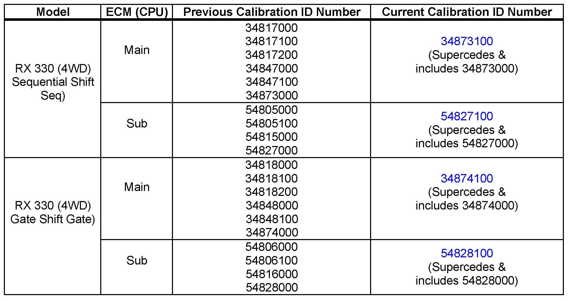 - The Calibration Identification Chart has been updated to include ALL 2005 model year RX 330 calibration IDs. Previous versions of this TSB would not allow updating of RX 330 vehicles built in the later part of 2005 model year.