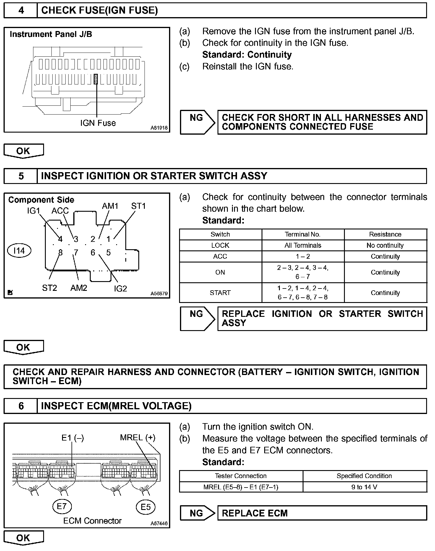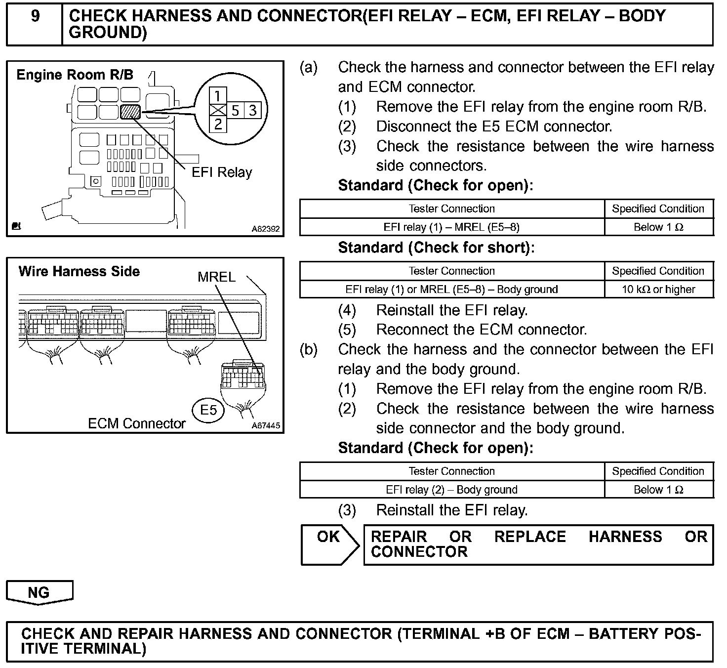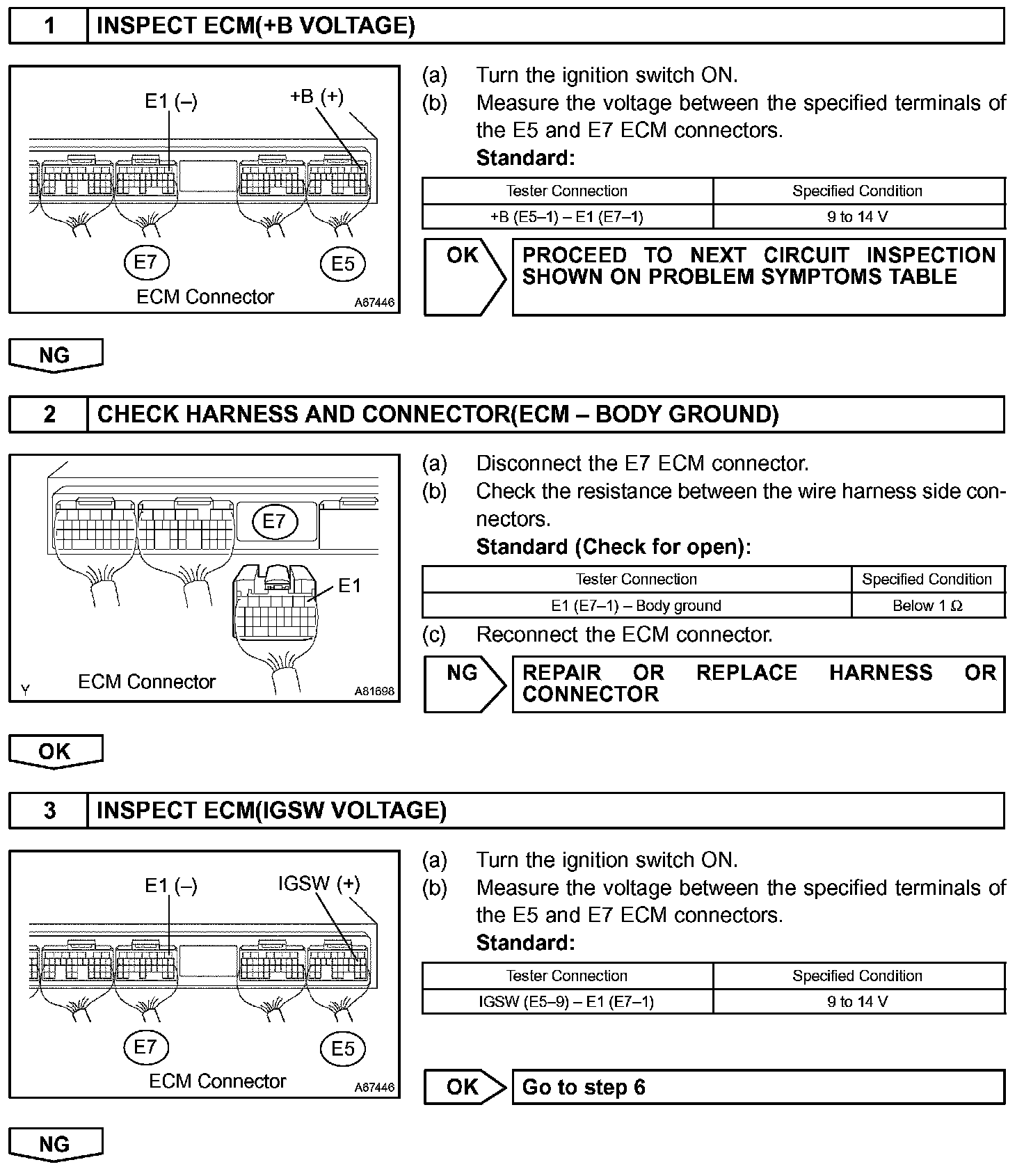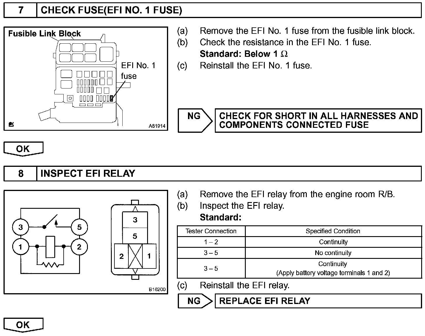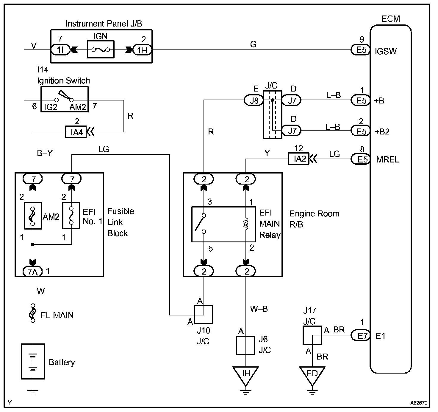 When the ignition switch is turned ON, battery voltage is applied to terminal IGSW of the ECM. The ECM "MREL" output signal energizes the EFI relay (Marked: EFI). This signal causes current to flow to the coil, closing the contacts of the EFI relay and supplying power to terminal +B of the ECM.