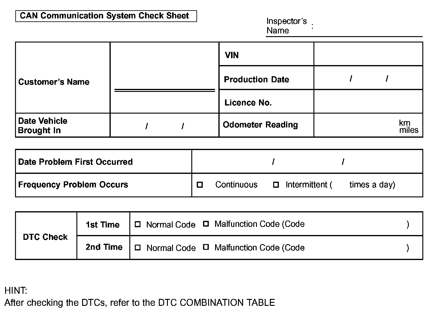 CAN Communication System Check Sheet: