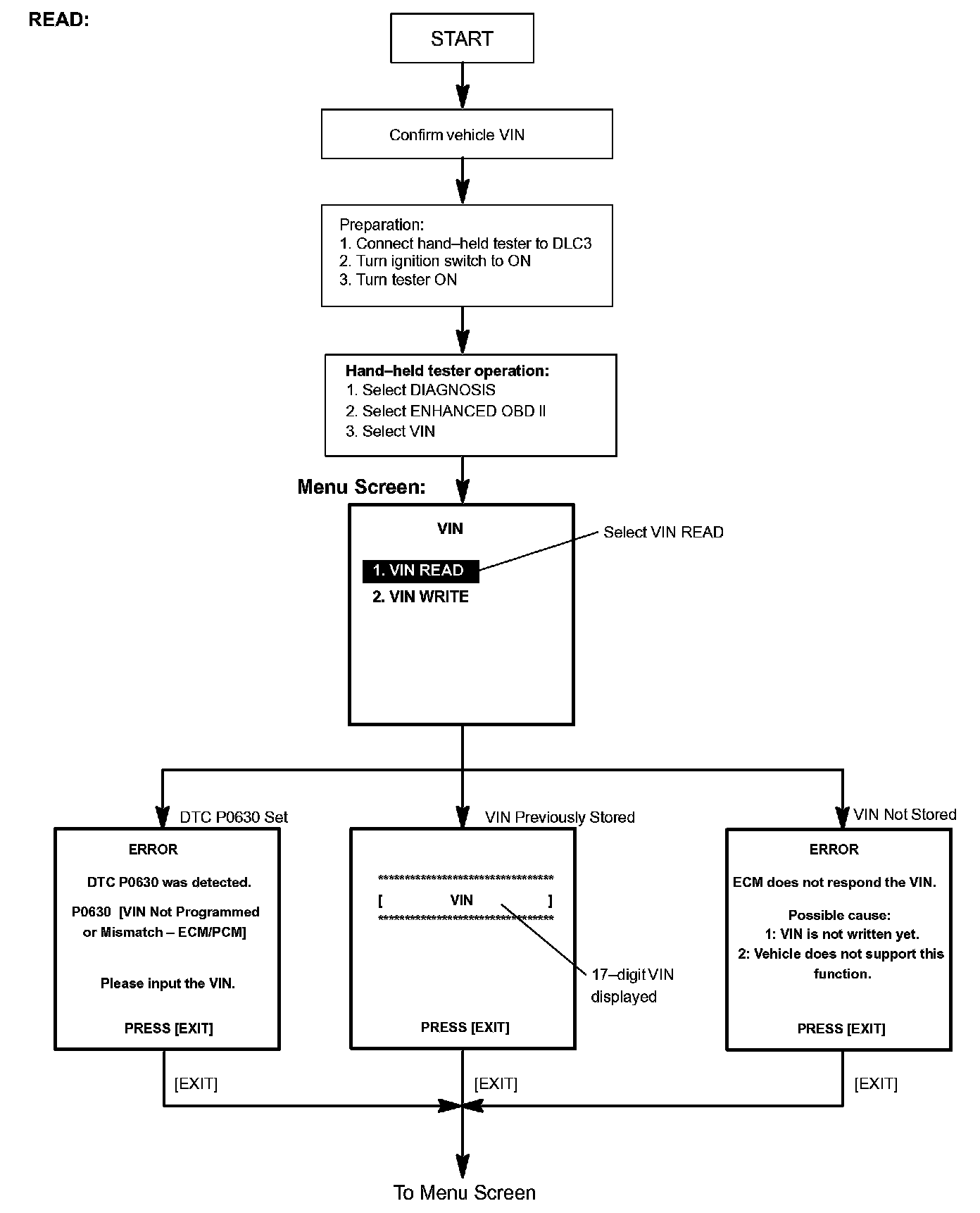 b. Read VIN: Explains the VIN reading process in a flowchart. This process allows the VIN stored in the ECM to be read, in order to confirm that the two VINs, provided with the vehicle and stored in the vehicle's ECM, are the same.