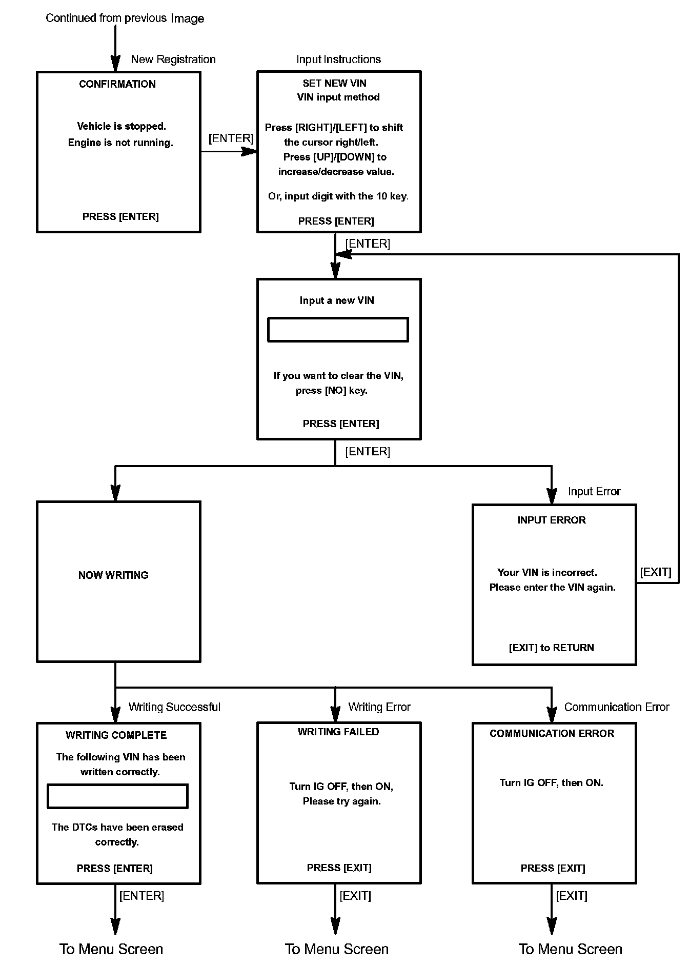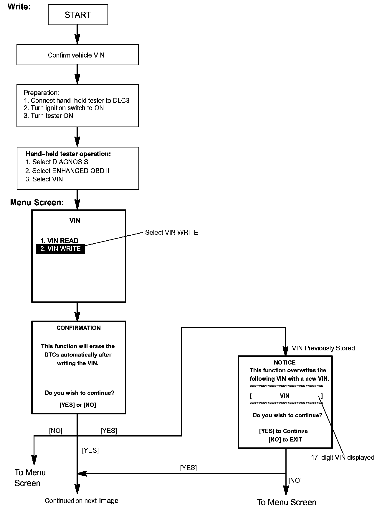c. Write VIN: Explains the VIN writing process in a flowchart. This process allows the VIN to be input into the ECM. If the ECM is changed, or the VIN and VIN do not match, the VIN can be registered, or overwritten in the ECM by following this procedure.