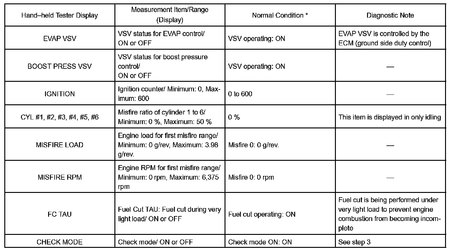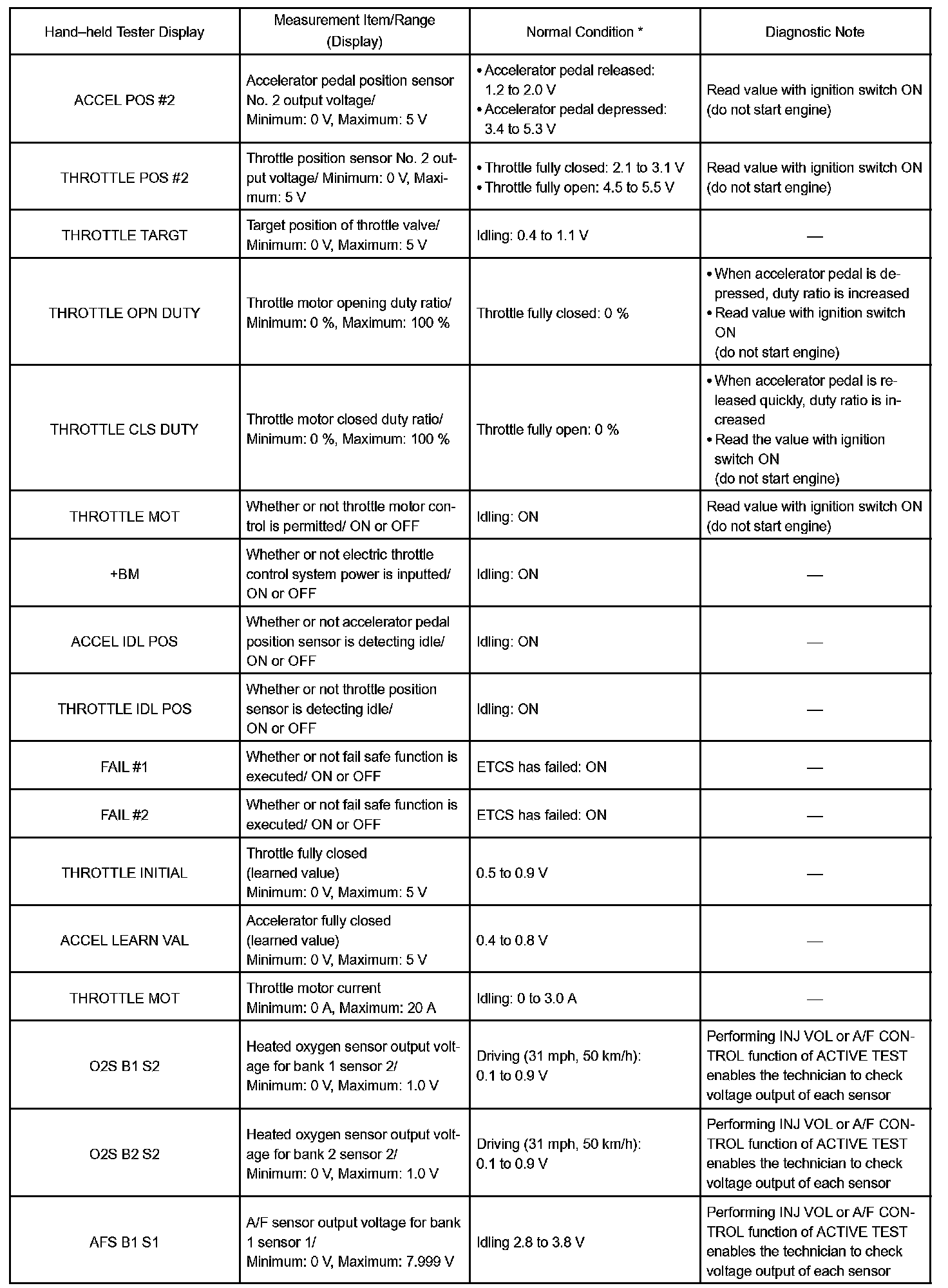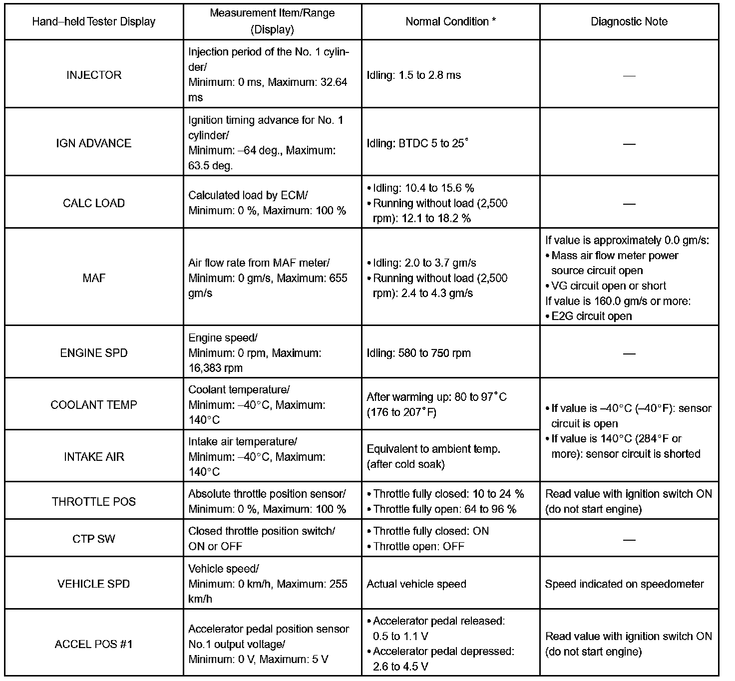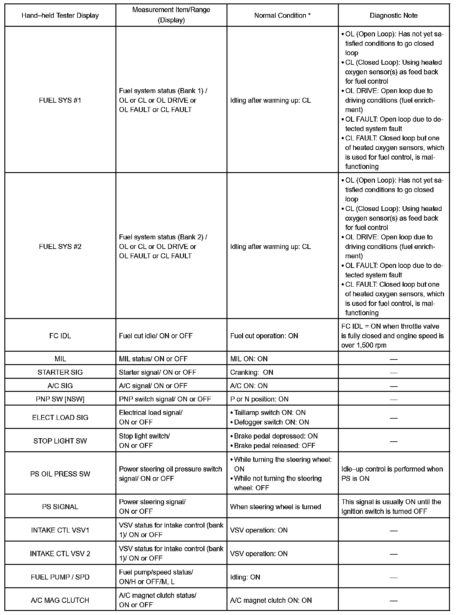 HINT: *: If no conditions are specifically stated for "Idling", the shift lever is in the N or P position, the A/C switch is OFF and all accessory switches are OFF.