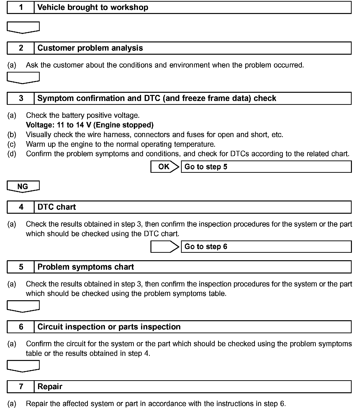 HINT: Carry out troubleshooting in accordance with the procedures given. Only the basic procedures are shown. Details are provided in the applicable diagnostics information, showing the most effective methods for each circuit. Confirm the troubleshooting procedures first for the relevant circuit before beginning troubleshooting of that circuit.