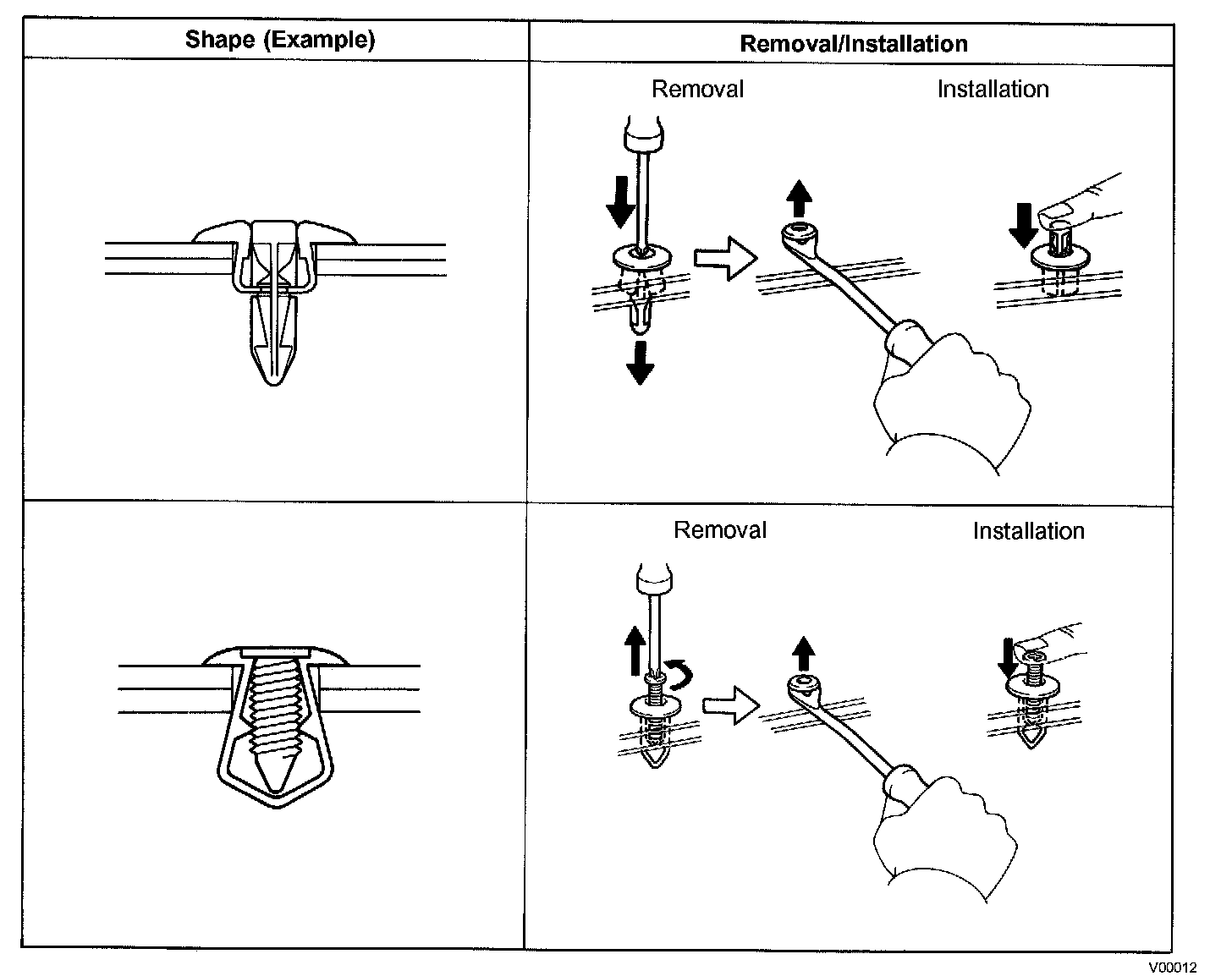 1. The removal and installation methods of typical clips used in body parts are shown in the table.