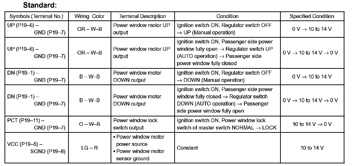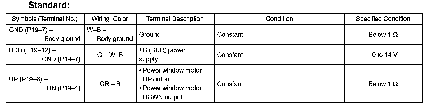 c. Reconnect the P19 switch connector and reset the power window motor (Refer to the pre check, step 16).