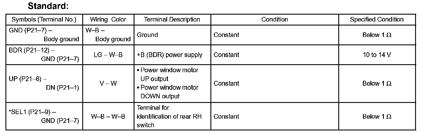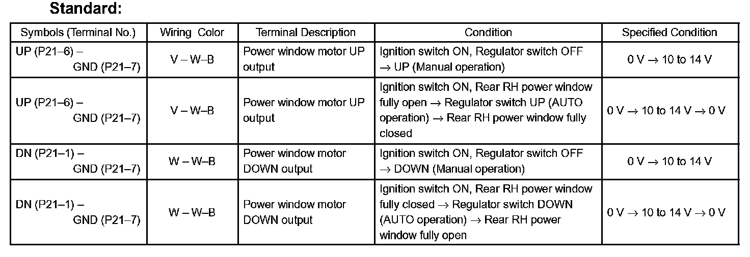 c. Reconnect the P21 switch connector and reset the power window motor (Refer to the pre check, step 16).