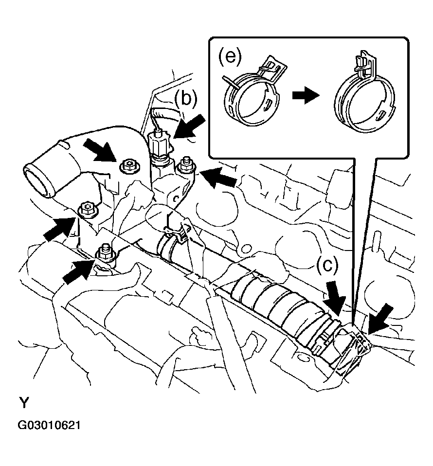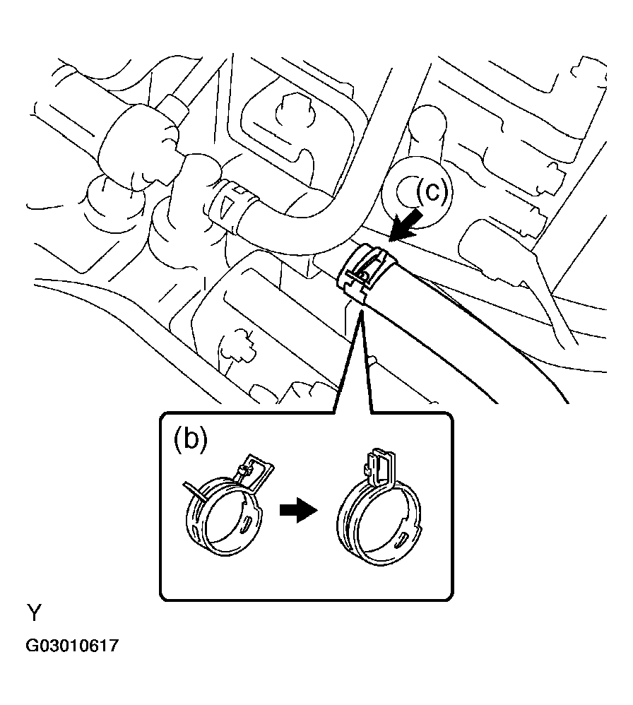 2. Install the water outlet together with water by-pass hose No. 1 and unlock the hose clamp.