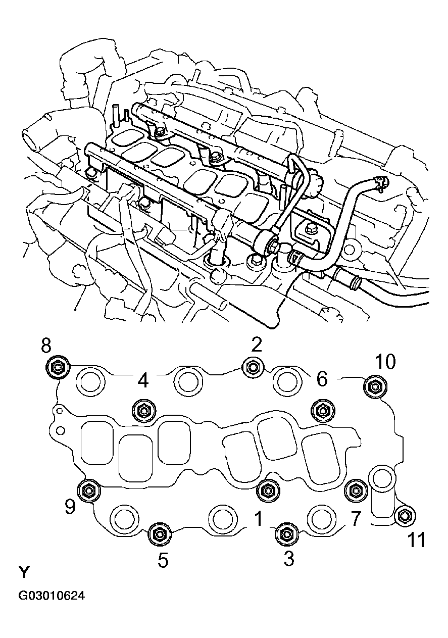 7. In order to remove the intake manifold, using several steps, remove the 9 bolts and 2 nuts in the sequence shown in Fig 5 .