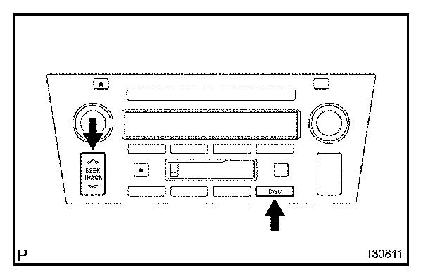 b. While simultaneously pressing the "SEEK UP" and "DISC" switches, turn the ignition switch to ACC.
