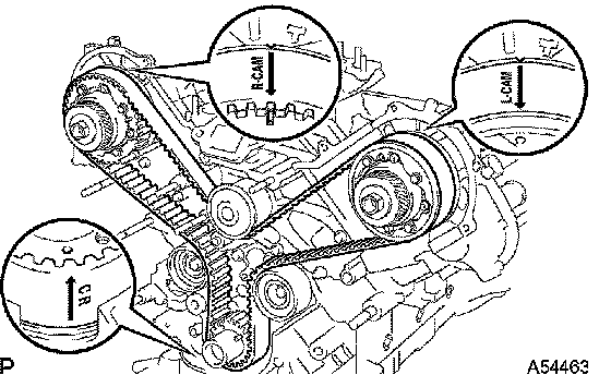 2. Check that the timing marks of the camshaft timing pulleys and timing belt plates are aligned.