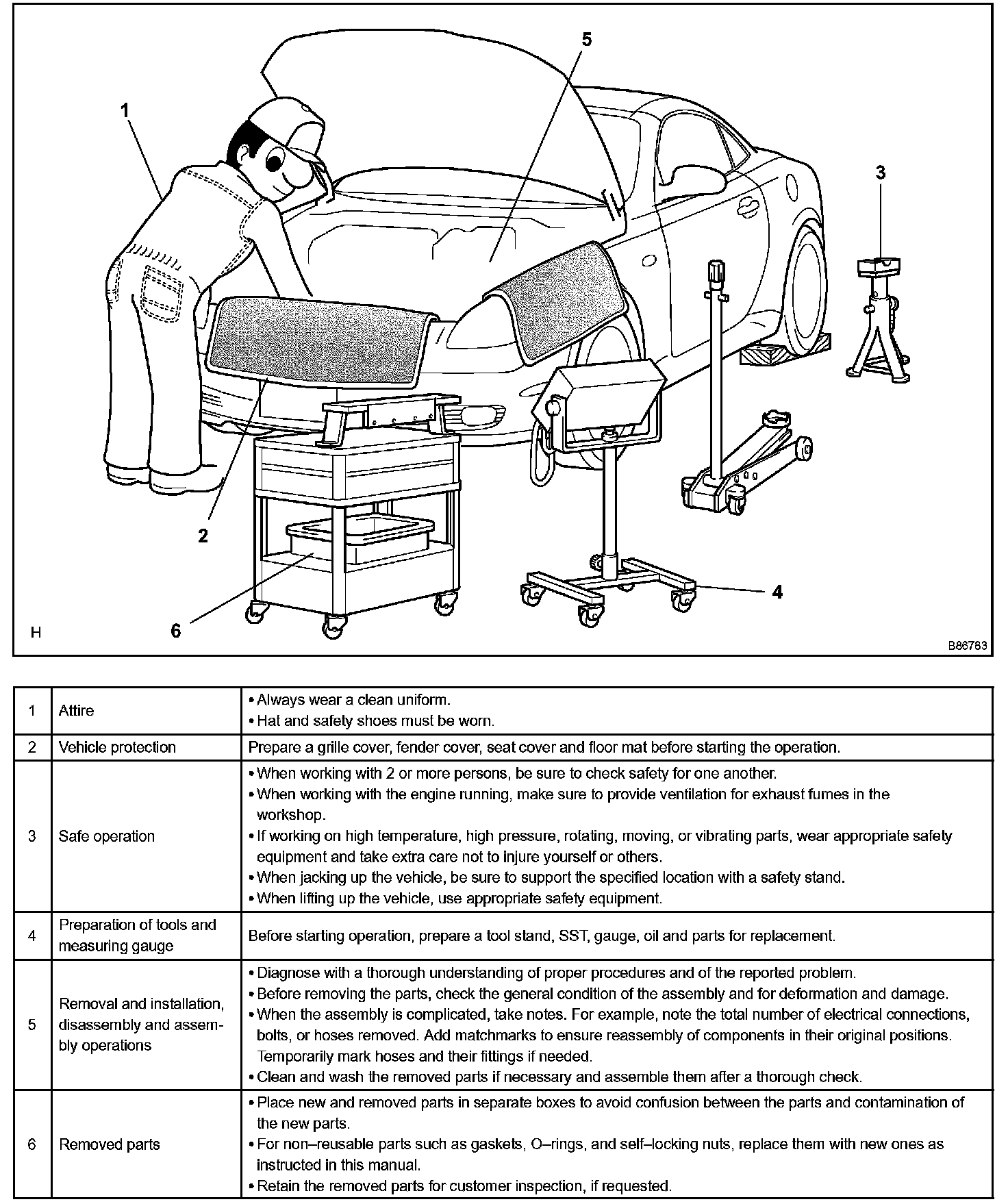 1. Care must be taken when jacking up and supporting the vehicle. Be sure to lift and support the vehicle at the proper locations.