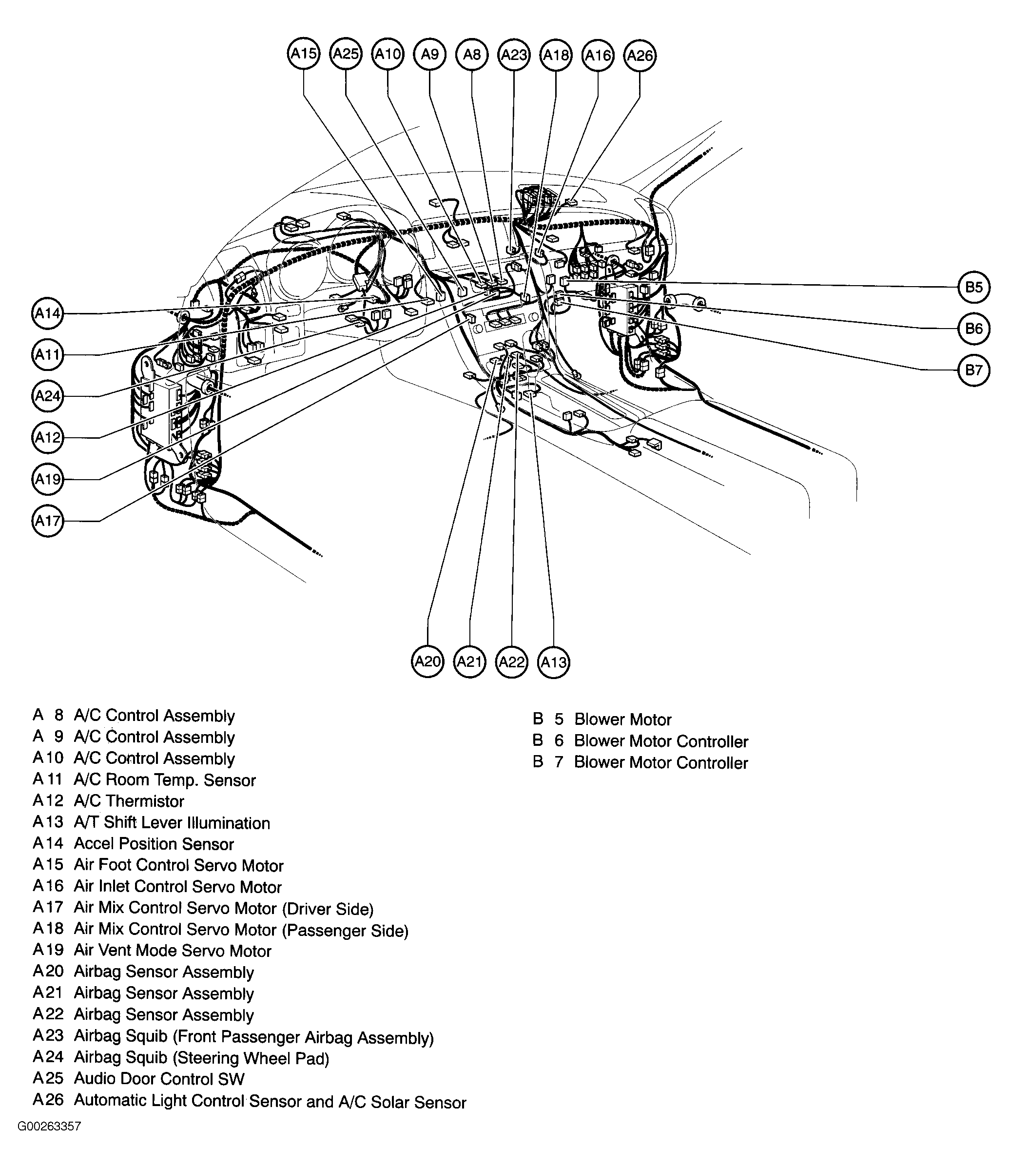 | A/C Control Assembly | Behind center of dash. See Figure. |