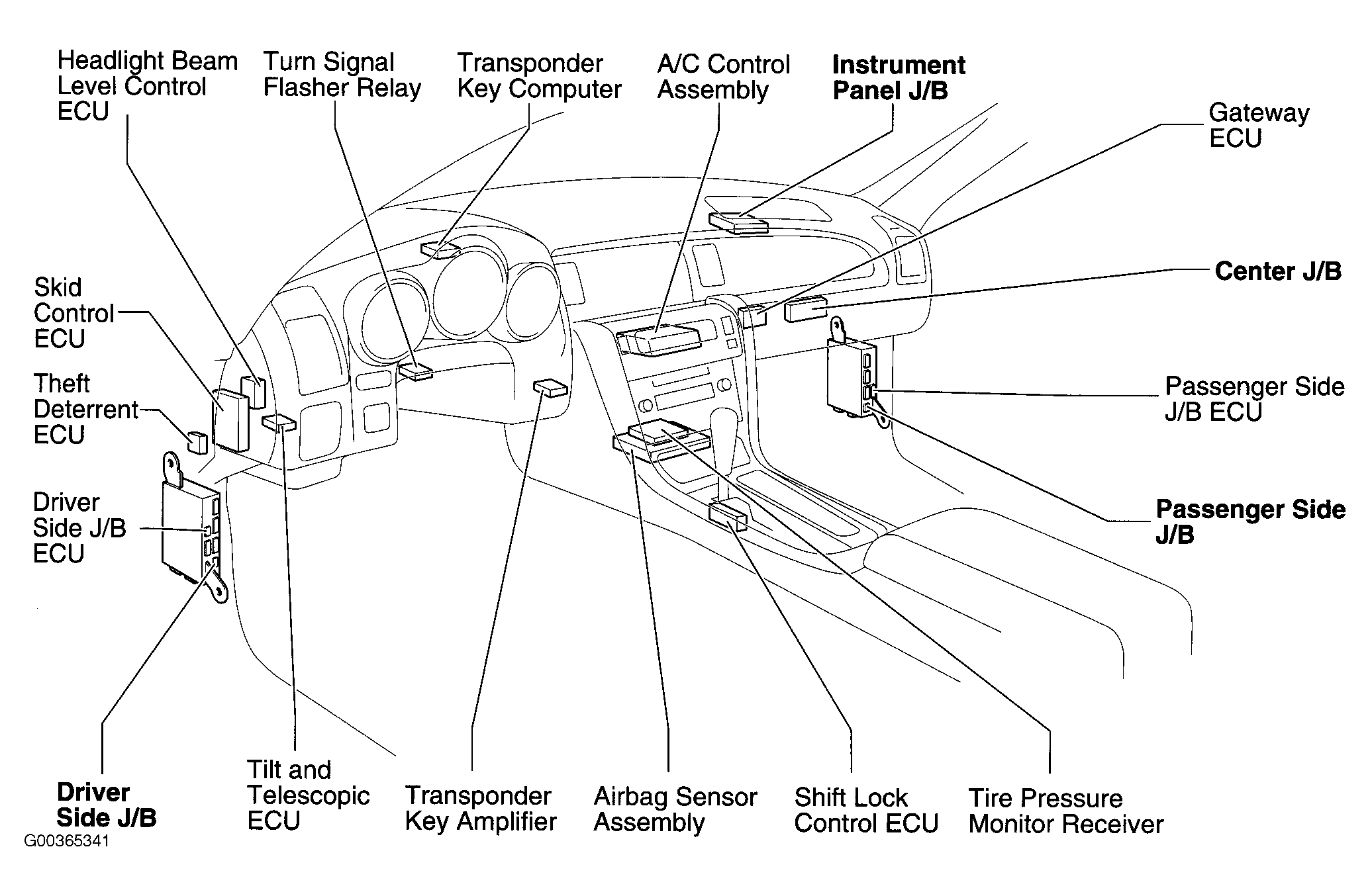 | Skid Control ECU | Behind left end of dash. See Figure. |