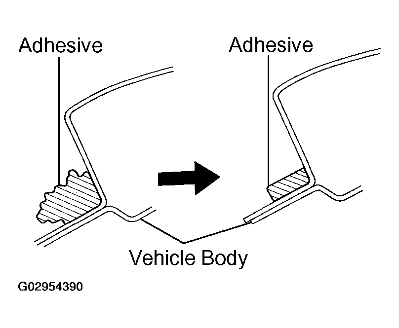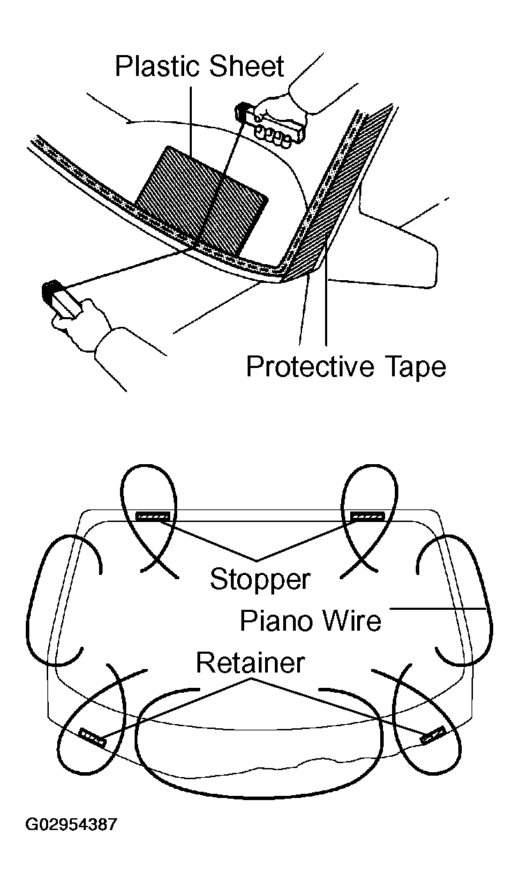 - Cut through the adhesive by pulling the piano wire around the glass.NOTE: Leave as much adhesive on the vehicle body as possible when cutting through the adhesive.