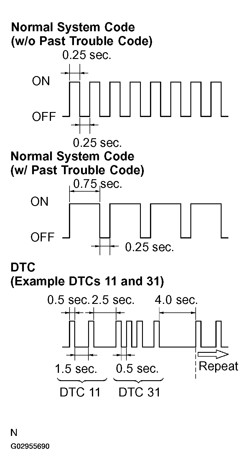 1. Read the blinking patterns of the DTCs. Examples of the blinking patterns for the normal system code and DTCs 11 and 31 are shown in Fig 2.