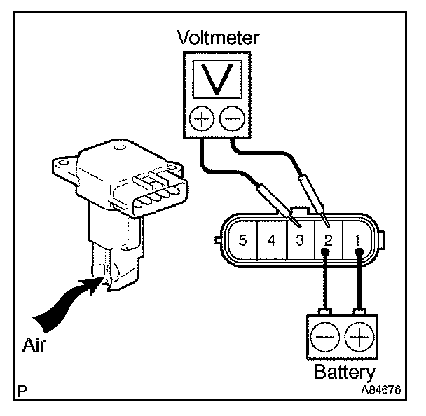 3. Blow air into the mass air flow sensor, then check that the voltage fluctuates.