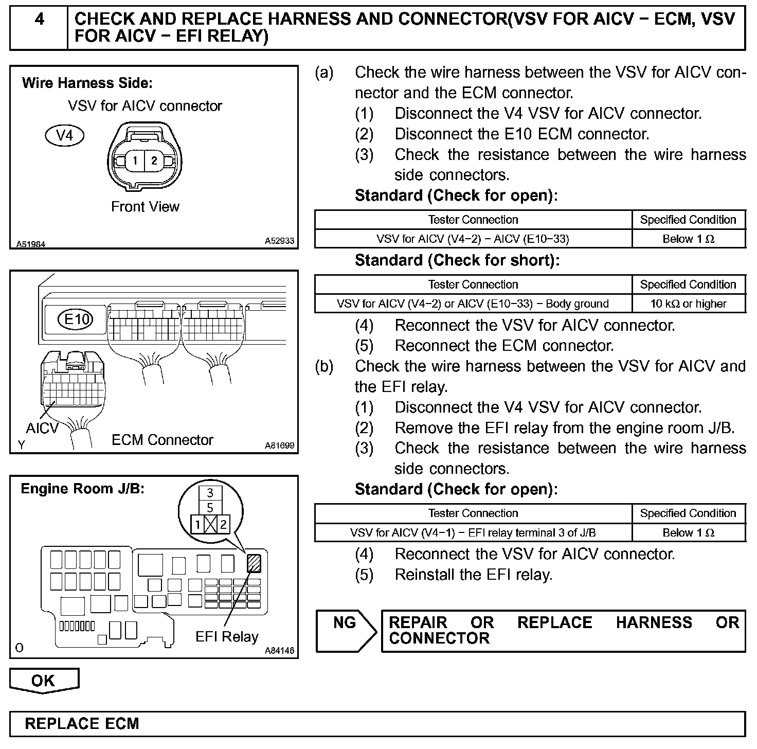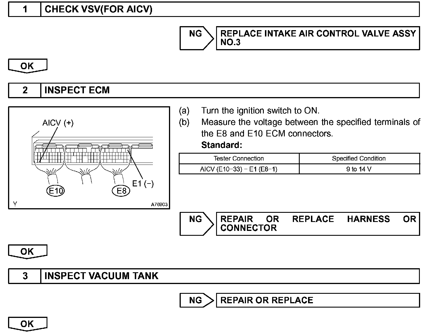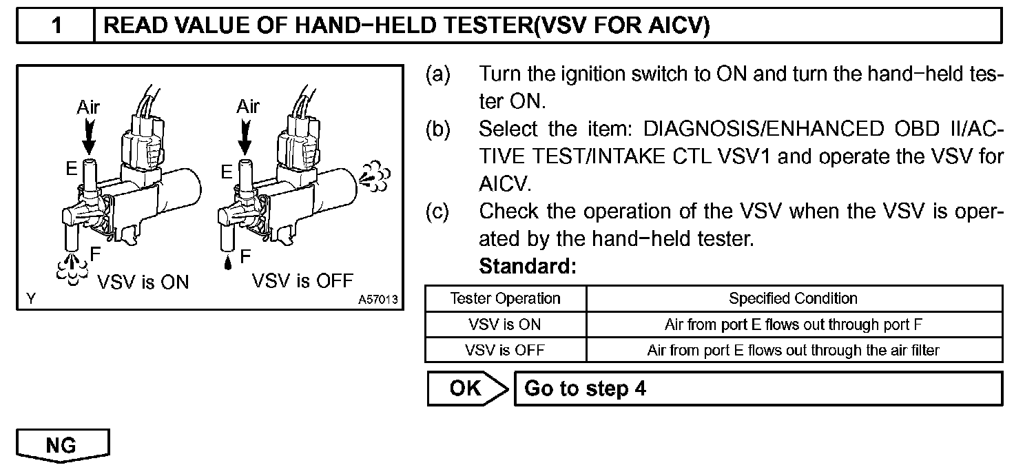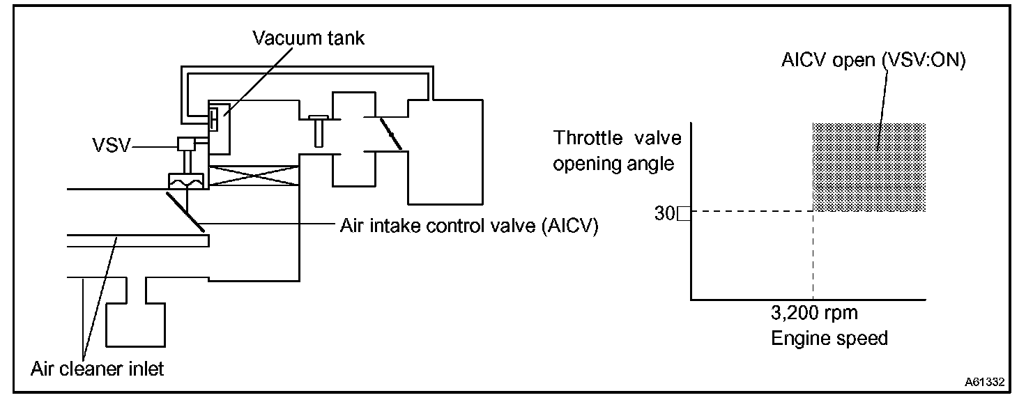 The air cleaner is equipped with two inlets, one of which is opened or closed by the Air Intake Control Valve (AICV). This system reduces intake noise and increases engine power at low to high engine speeds range. When the engine is operating in the low-to mid-speed range, this control operates the AICV to close one of the air cleaner inlets. When the engine speed is more than 3,200 rpm and the opening angle of the throttle valve is more than 30 degree, the ECM activates the VSV and opens the AICV.