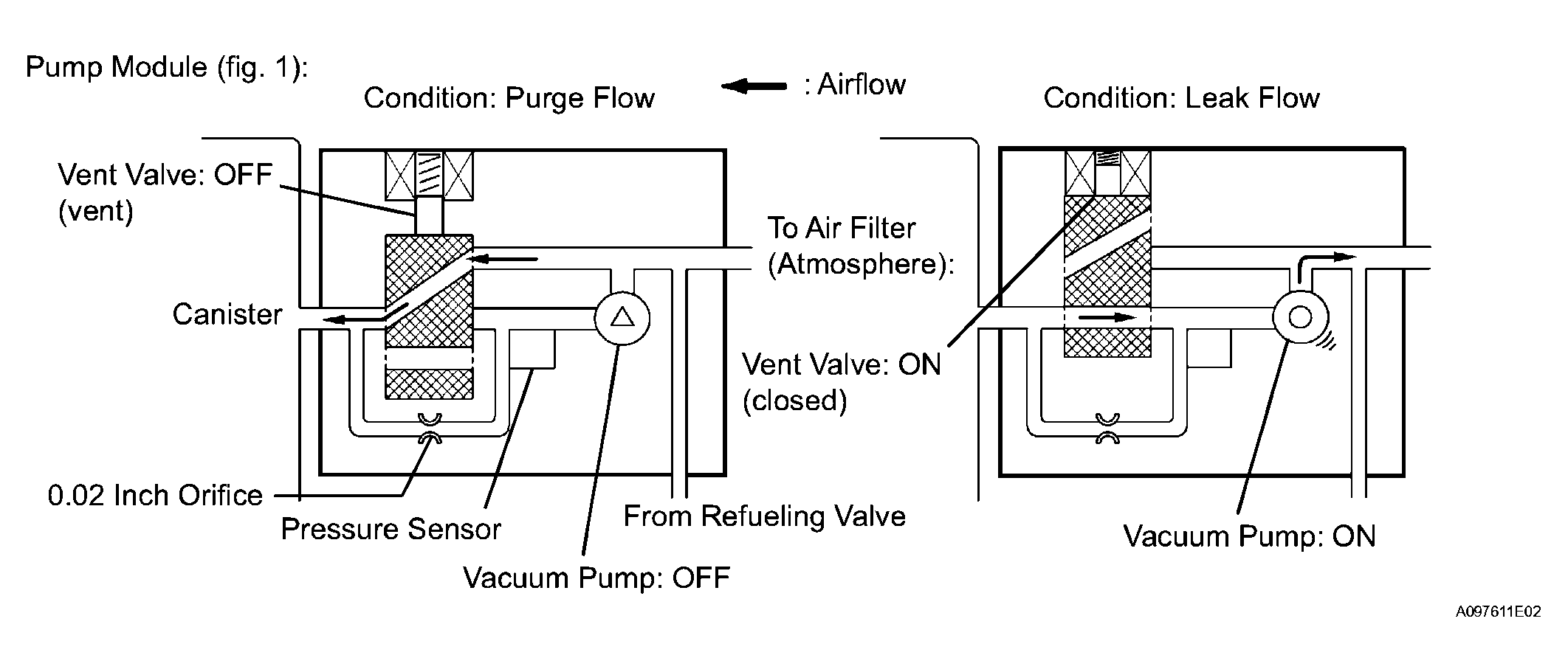 COMPONENTS OPERATION CHARTComponent Operation Canister Contains activated charcoal to absorb EVAP generated in fuel tank. Cut-off valve Located in fuel tank. Valve floats and closes when fuel tank 100% full. EVAP VSV (Vacuum Switching Valve) Opens or closes line between canister and intake manifold. ECM uses EVAP VSV to control EVAP purge flow. In order to discharge EVAP absorbed by canister to intake manifold, ECM opens EVAP VSV. EVAP discharge volume to intake manifold controlled by EVAP VSV duty cycle ratio (current-carrying time) (open: ON, close: OFF). Refueling valve Controls EVAP pressure from fuel tank to canister. Valve consists of diaphragm, spring and restrictor (diameter: 0.08 inch). When fuel vapor and pressure inside fuel tank increase, valve opens. While EVAP purged, valve closes and restrictor prevents large amount of vacuum from affecting pressure in fuel tank. Valve opens while refueling. Roll-over valve Located in fuel tank. Valve closes by its own weight when vehicle overturns to prevent fuel from spilling out. Service port Used for connecting vacuum gauge for inspecting EVAP system. Soak timer Built into ECM. To ensure accurate EVAP monitor, measures 5 hours (+-15 min) after engine switch off. This allows fuel to cool down, stabilizing Fuel Tank Pressure (FTP). When approximately 5 hours elapsed, ECM activates. Pump module Consists of (a) to (d) below. Pump module cannot be disassembled. (a) Vent valve Vents and closes EVAP system. When ECM turns valve ON, EVAP system closed. When, ECM turns valve OFF, EVAP system vented. Negative pressure (vacuum) created in EVAP system to check for EVAP leaks by closing EVAP VSV, turning vent valve ON (closed) and operating vacuum pump (refer to Fig 4). (b) Pressure sensor Indicates pressure as voltage. ECM supplies regulated 5 V to pressure sensor, and uses feedback from sensor to monitor EVAP system pressure (refer to Fig 5). (c) Vacuum pump Creates negative pressure (vacuum) in EVAP system for leak check. (d) 0.02 inch orifice Has opening with 0.02 inch diameter. Vacuum produced through orifice by closing EVAP VSV, turning vent valve OFF and operating vacuum pump, to monitor 0.02 inch leak pressure. 0.02 inch leak pressure indicates small leak of EVAP. - The 1st monitor