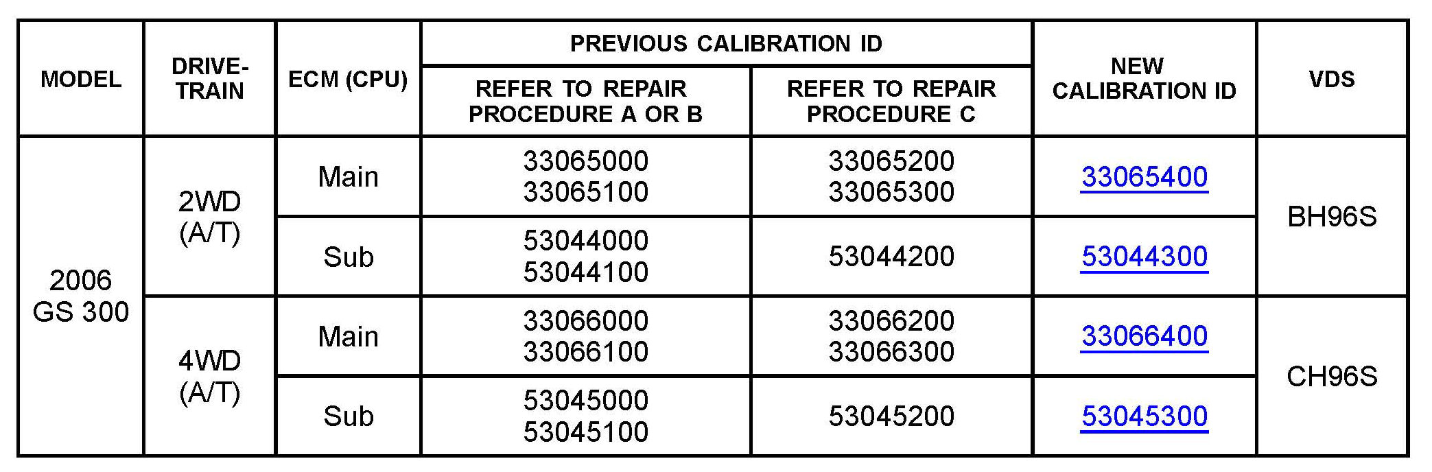 ^ Repair Procedure has been divided into 3 procedures according to DTC(s) and calibration IDs. TSIB Nos. EGOO7-07 and EGOO8-07 are now obsolete.