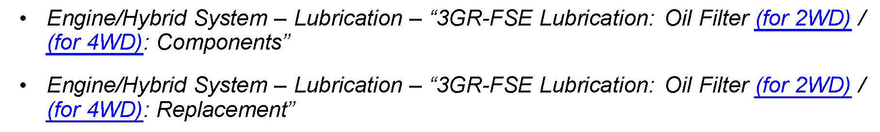^ Engine/Hybrid System - Lubrication - "3GR-FSE Lubrication: Oil Filter (for 2WD) / (for 4WD): Replacement"