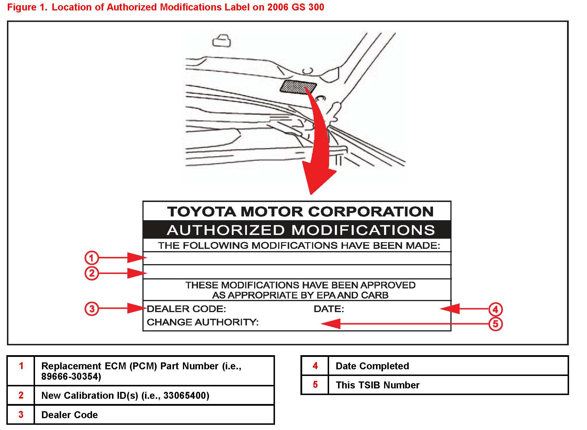 2. Check for the Authorized Modifications Label affixed to the vehicle in the location shown in Figure 1. Confirm if the ECM (PCM) calibration has been updated. If the calibration ID listed is NOT the latest ECM (PCM) calibration - go to step 3.