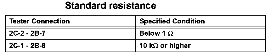 2. Connect the battery's positive (+) lead to terminals 2A-8 and 2C-1, and negative (-) lead to terminal 2B-3 and 2B-7. Using an ohmmeter, check that there is resistance between terminals 2C-1 and 2B-8 when battery voltage is applied between the terminals.