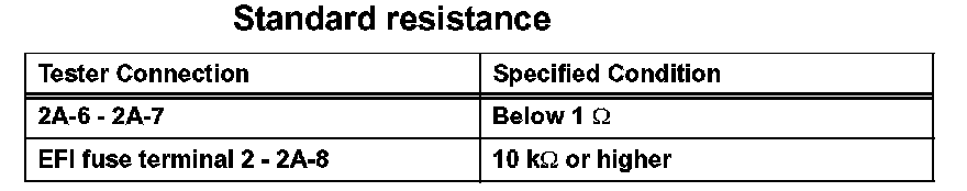 1. Remove the EFI fuse. Using an ohmmeter, measure the resistance between the terminals.