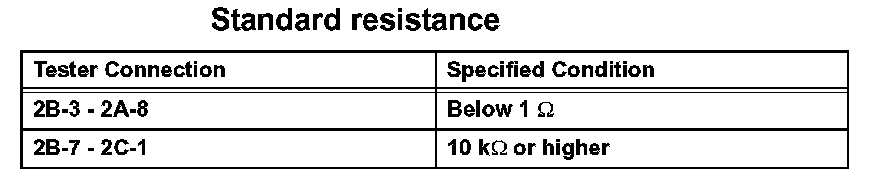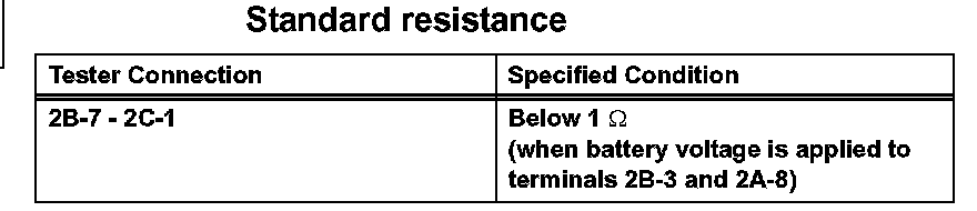 2. Connect the battery's positive (+) lead to terminal 2A-8 and negative (-) lead to terminal 2B-3. Using an ohmmeter, check that there is resistance between terminals 2B-7 and 2C-1 when battery voltage is applied between the terminals.