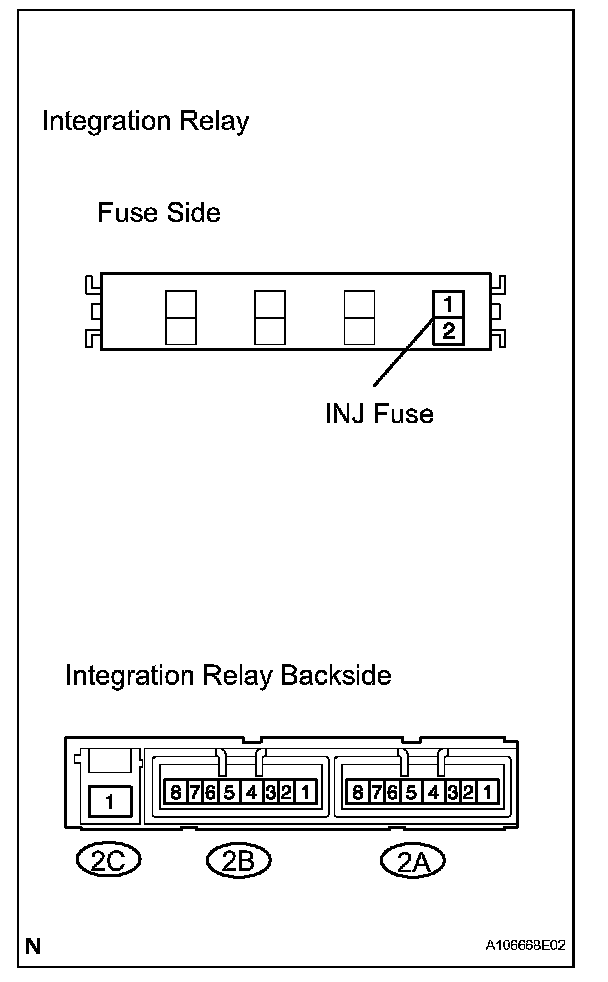 2. Connect the battery's positive (+) lead to terminal 2A-1 and negative (-) lead to terminal 2A-3. Using an ohmmeter, check that there is resistance between INJ fuse terminals 2 and terminal 2A-4 when battery voltage is applied between the terminals.