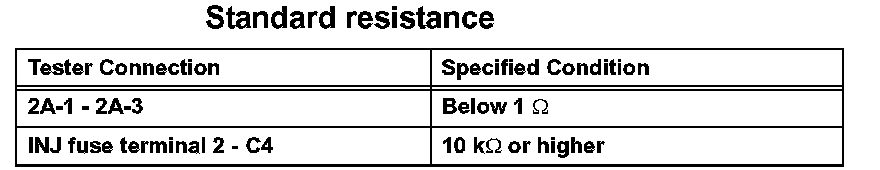 1. Remove the INJ fuse. Using an ohmmeter, measure the resistance between the terminals.