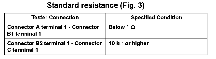 HINT: Measure the resistance while lightly shaking the wire harness vertically and horizontally. If the results match the examples above, an open circuit exists between terminal 1 of connector A and terminal 1 of connector C.