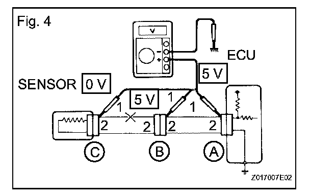 If the results match the examples above, an open circuit exists in the wire harness between terminal 1 of connector B and terminal 1 of connector C.