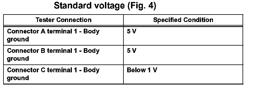 With each connector still connected, measure the voltage between the body ground and these terminals (in this order): 1) terminal 1 of connector A, 2) terminal 1 of connector B, and 3) terminal 1 of connector C.