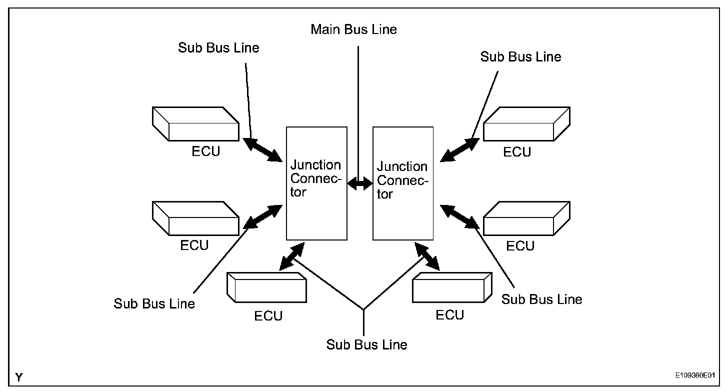 2. CAN communication uses the bus style network to connect ECUs. This network consists of a main bus line (comprising junction connectors and a sub bus line (comprising ECUs that are connected to the main bus line). This style enables communication among all the connected ECUs.