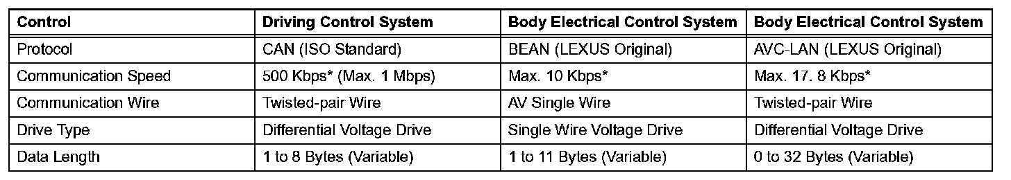 1. The CAN, BEAN and AVC-LAN protocols have set guidelines for data. The guidelines include communication speed, type of communication wire, drive type and data length. These guidelines are established to facilitate ECU data communication.