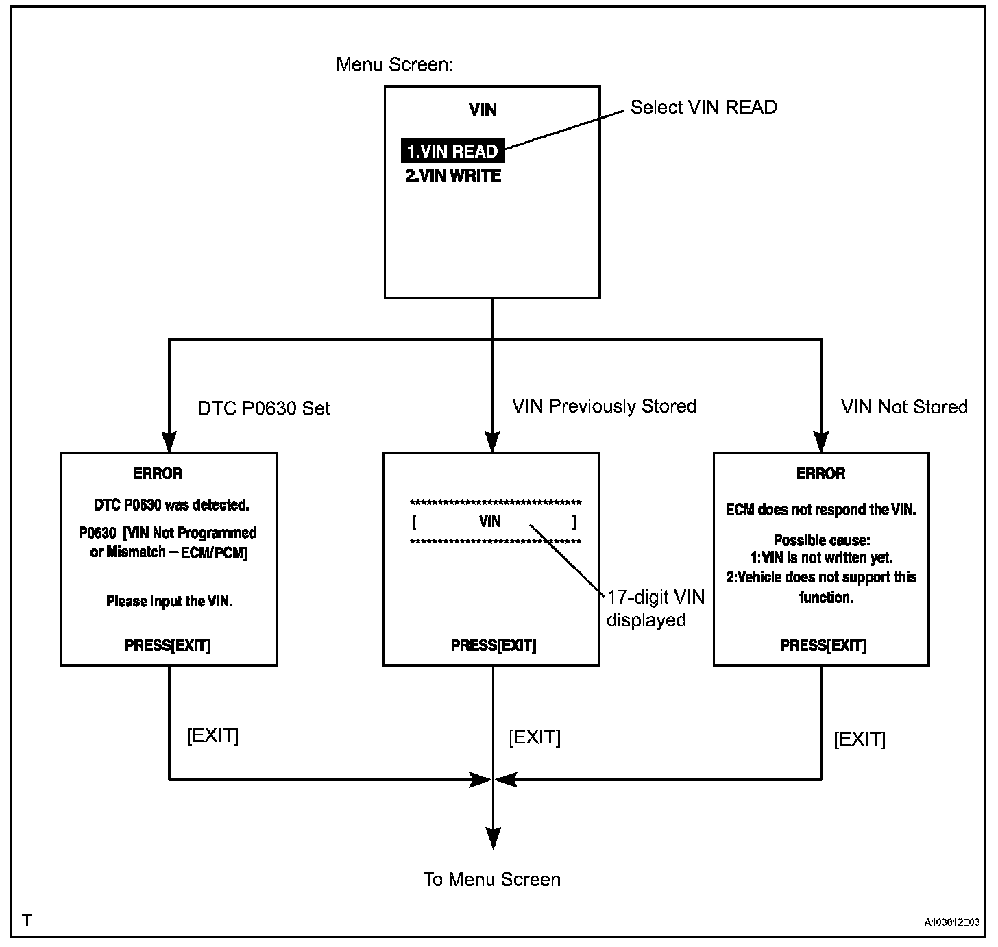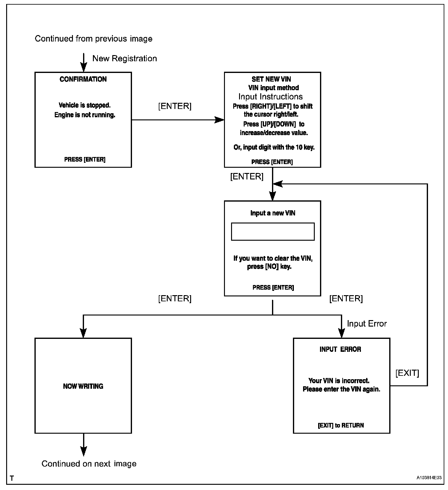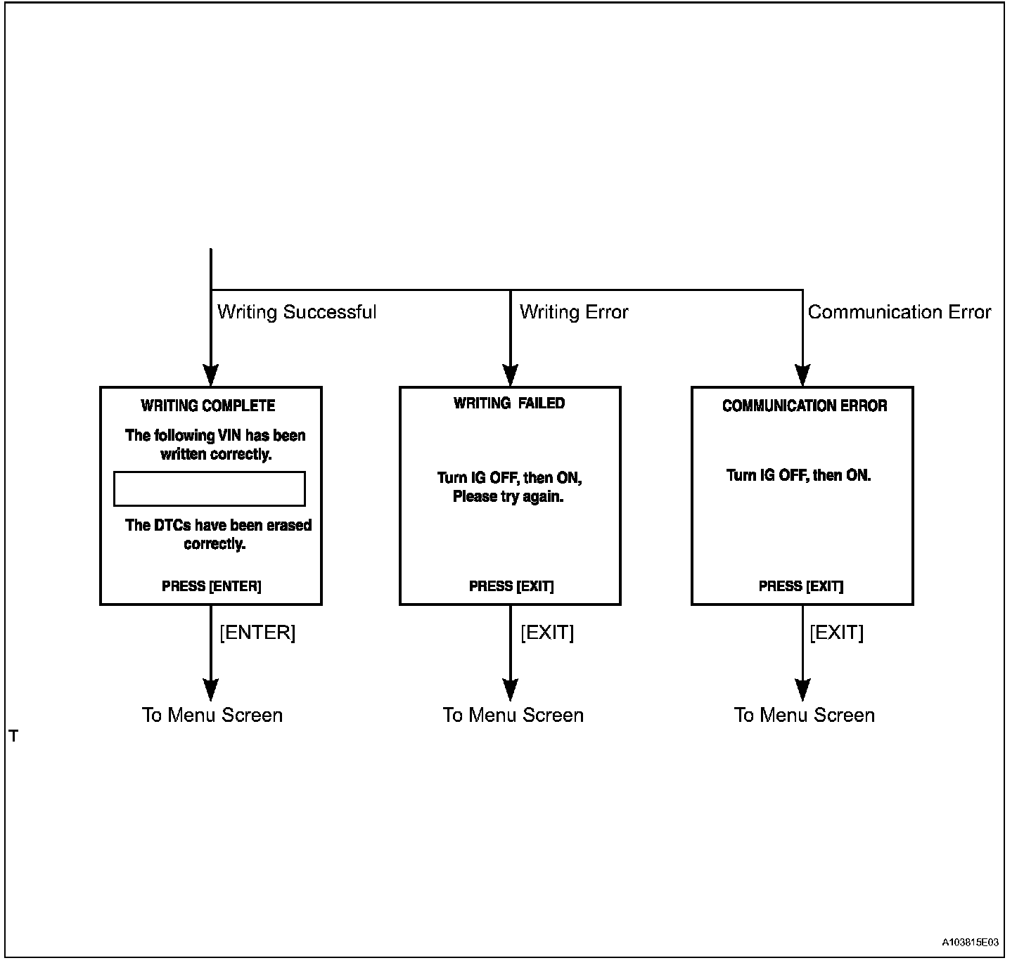 a. Explains the VIN writing process in a flowchart. This process allows the VIN to be input into the ECM. If the ECM is changed, or the ECM VIN and Vehicle VIN do not match, the VIN can be registered, or overwritten in the ECM by following this procedure.