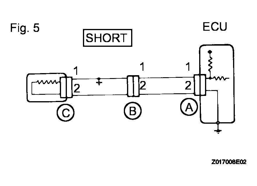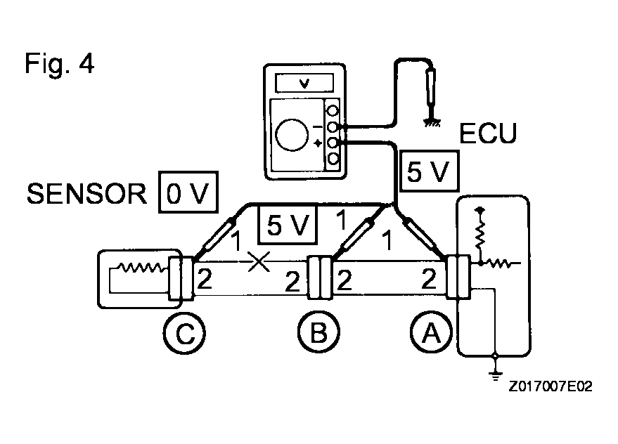 TESTER CONNECTION SPECIFIED CONDITION SPECIFICATIONTester Connection Specified Condition Connector A terminal 1 - Body ground 5 V Connector B terminal 1 - Body ground 5 V Connector C terminal 1 - Body ground Below 1 V If the results match the examples above, an open circuit exists in the wire harness between terminal 1 of connector B and terminal 1 of connector C.