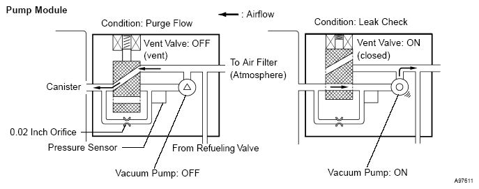 Has opening with 0.02 inch diameter. Vacuum produced through orifice by closing purge VSV, turning off vent valve and operating vacuum pump, to monitor 0.02 inch leak pressure. 0.02 inch leak pressure indicates small leak of EVAP. | ||