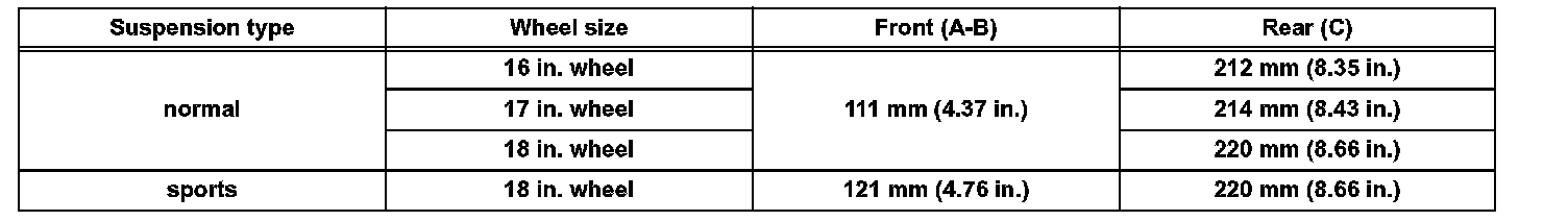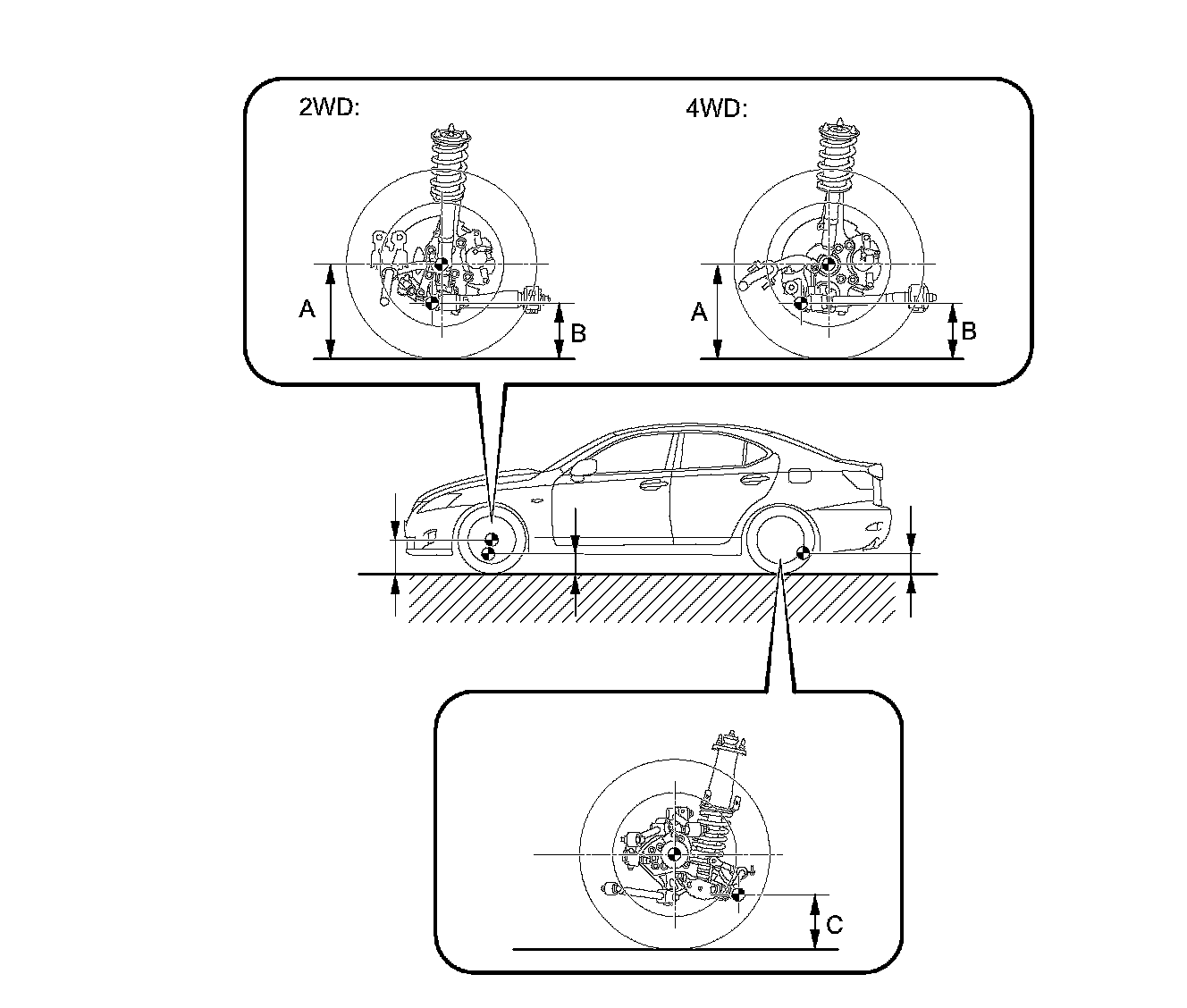 ^ If it is required to go under the vehicle for measurement, confirm that the parking brake is applied and the vehicle is secured with chocks.