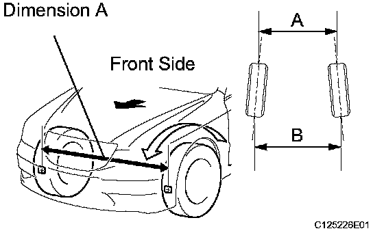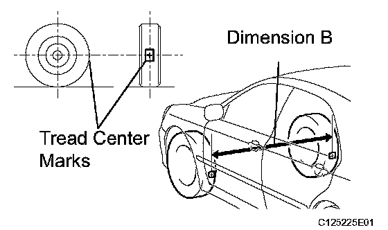 d) Put tread center marks on the rearmost points of the front wheels and measure the distance between the marks (dimension B).