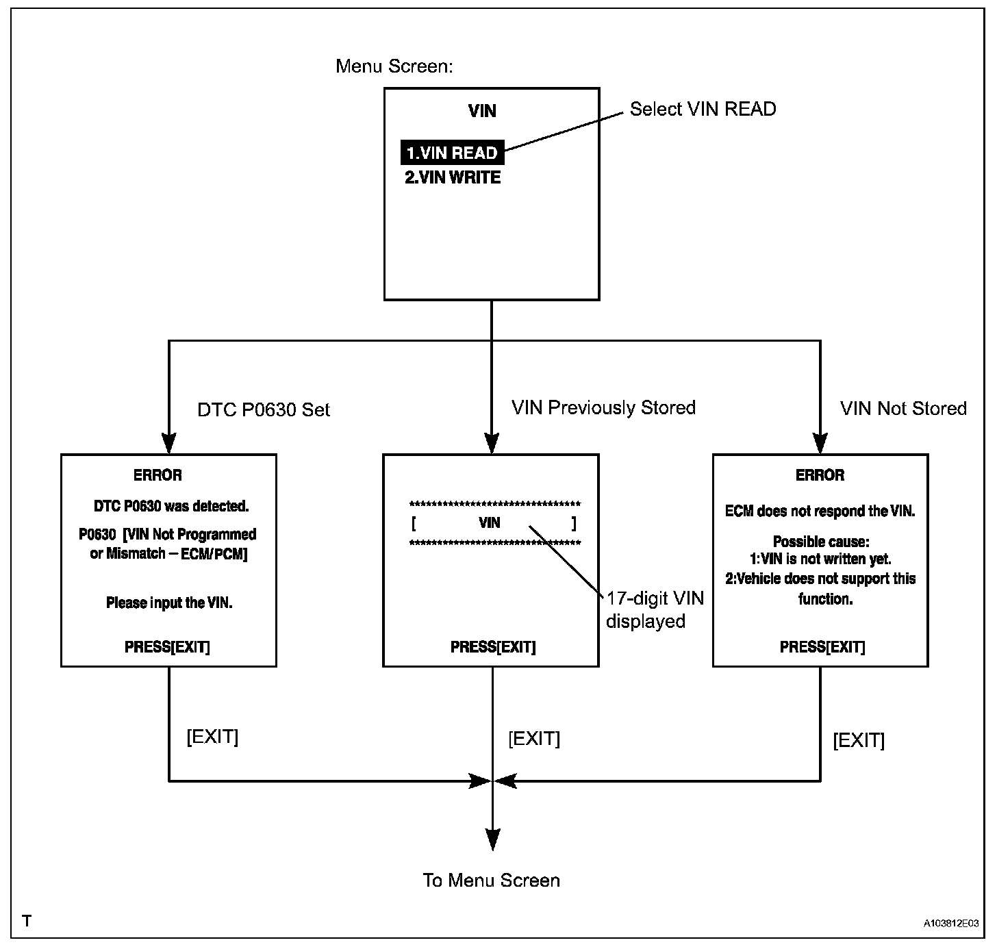 a. The flowchart of the VIN reading process is shown. This process allows the VIN stored in the ECM to be read, in order to confirm that the two VINs, provided with the vehicle and stored in the vehicle's ECM, are the same.