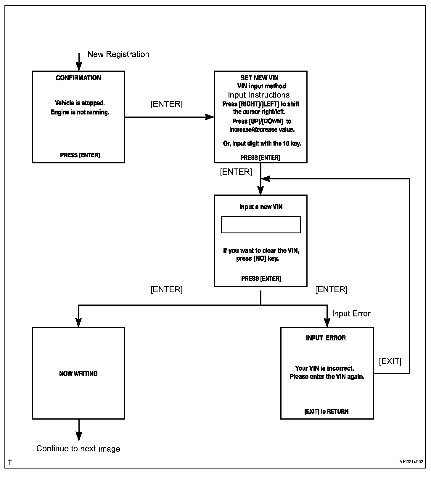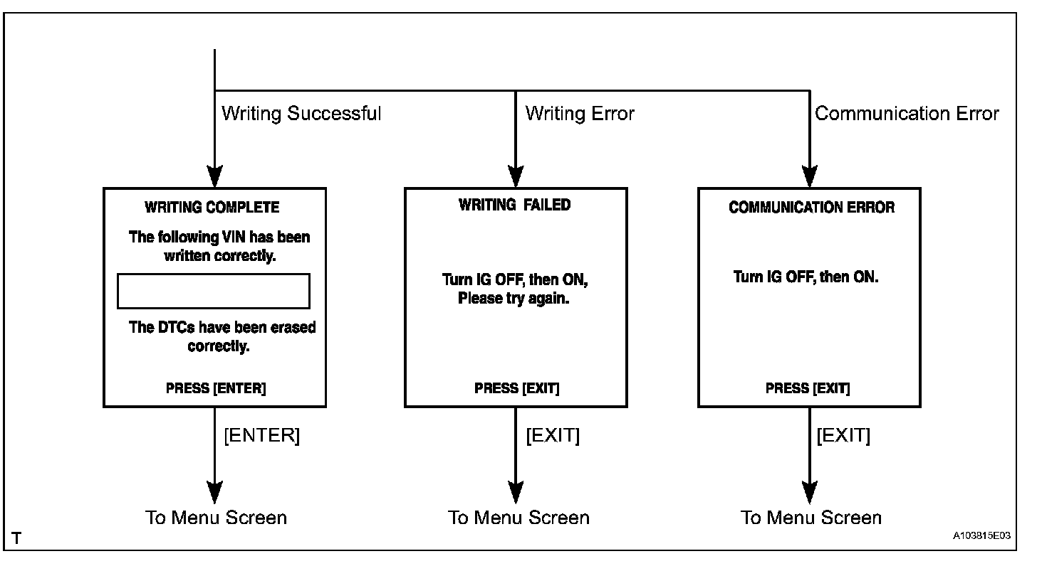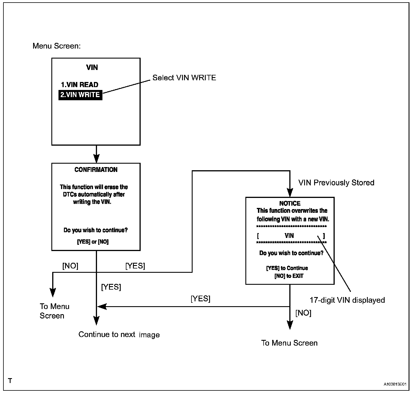 a. The flowchart of the VIN writing process is shown. This process allows the VIN to be input into the ECM. If the ECM is changed, or the VINs do not match, the VIN can be registered, or overwritten in the ECM by following this procedure.