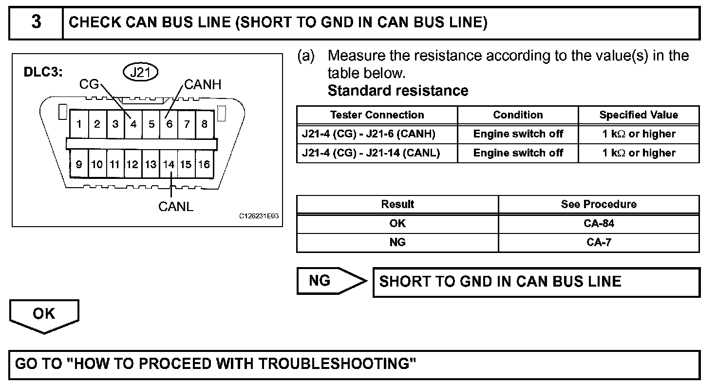 When any DTC for the CAN communication system is output, first measure the resistance between the terminals of the DLC3 to specify the trouble area.Then check that there is no short in the CAN main bus line, between the CAN bus lines, to +B, or to GND.