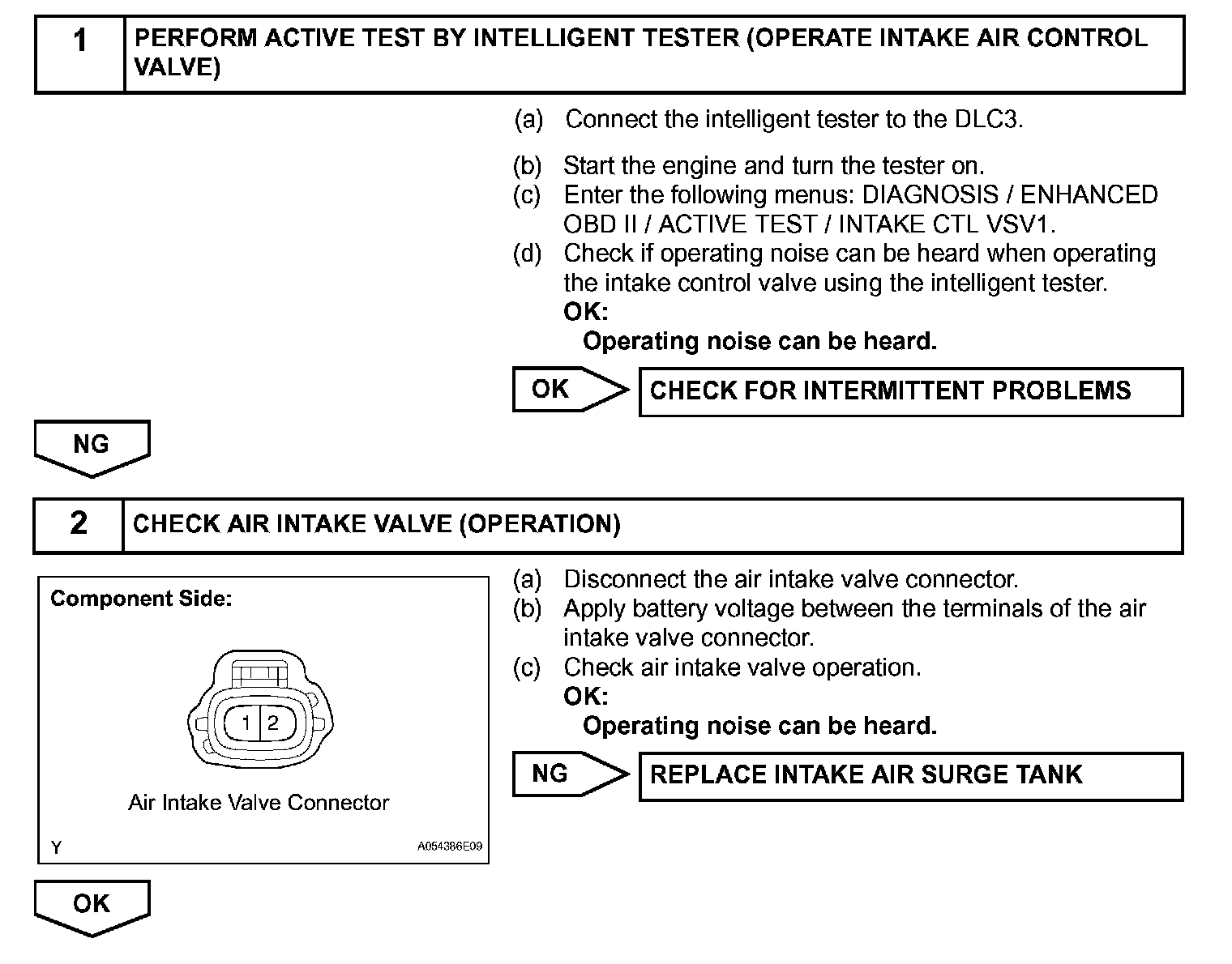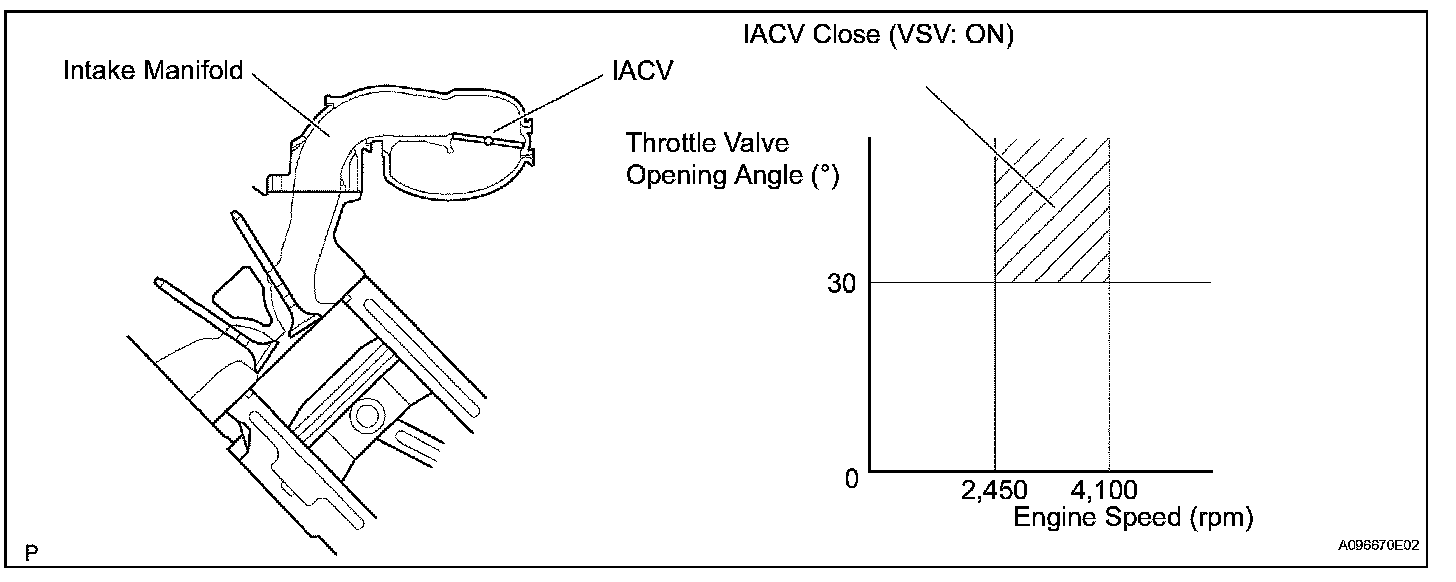 When the Intake Air Control Valve (IACV) opens and closes, the ACIS control circuit causes the engine load intake efficiency to increase. When the engine is running at 2,450 to 4,100 rpm and the throttle valve opening angle is 30 degrees or more, current flows through the ACIS control circuit and the IACV closes. For all other situations, current does not flow through the ECM and the IACV is open.
